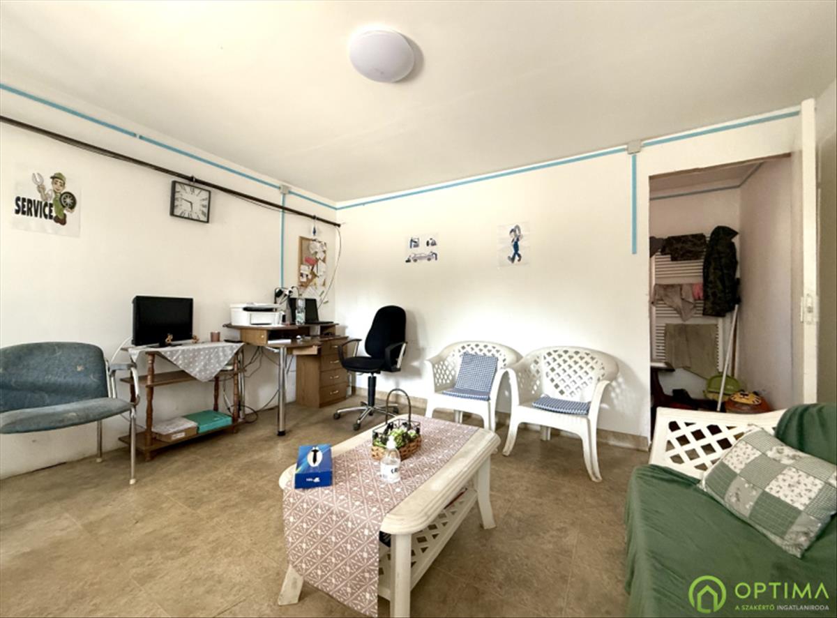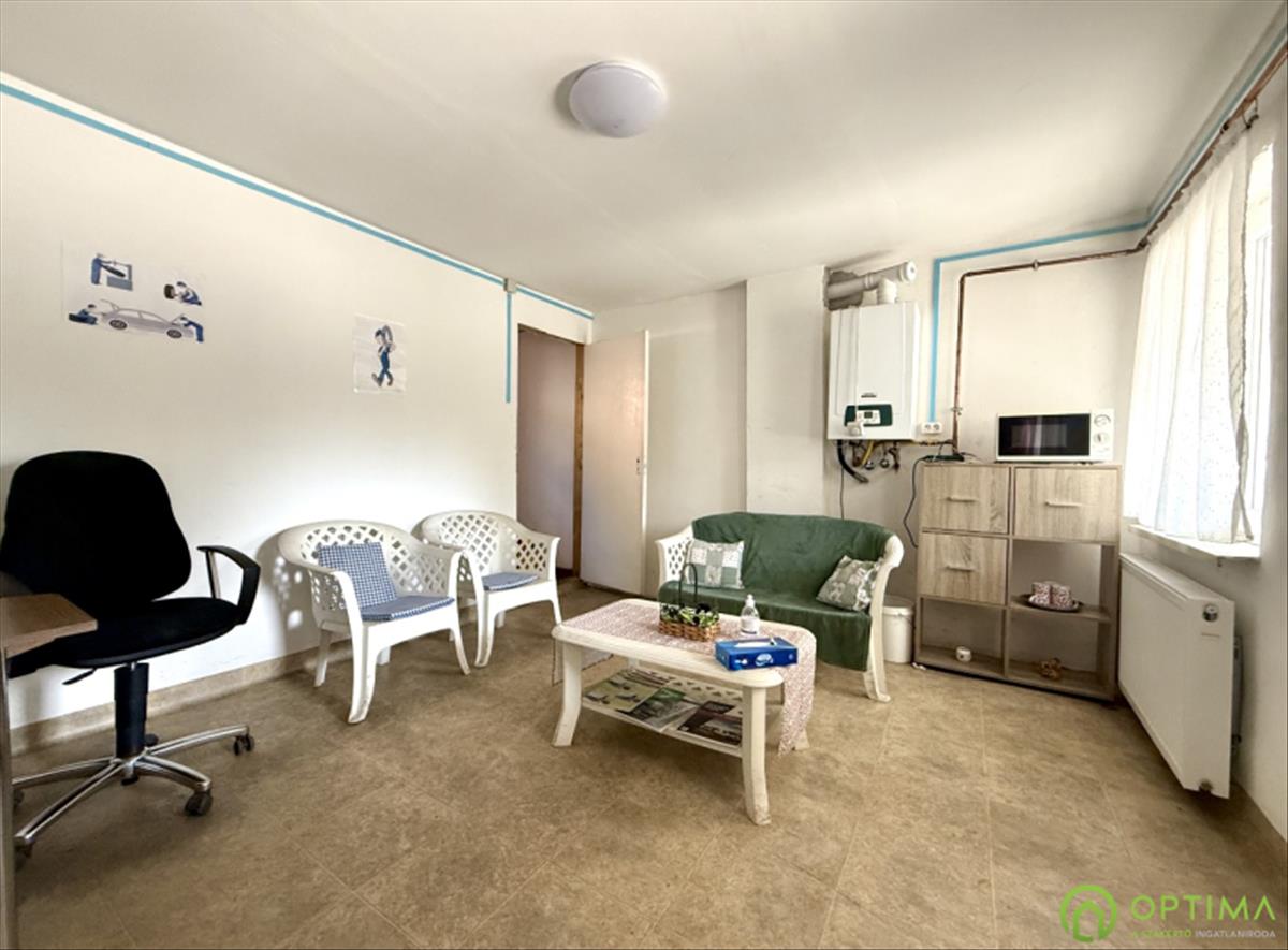 Továbbá egy közel 20 m2 alapterületű kiszolgálóhelyiség áll rendelkezésre, ahol jelenleg iroda, valamint vizesblokk található.