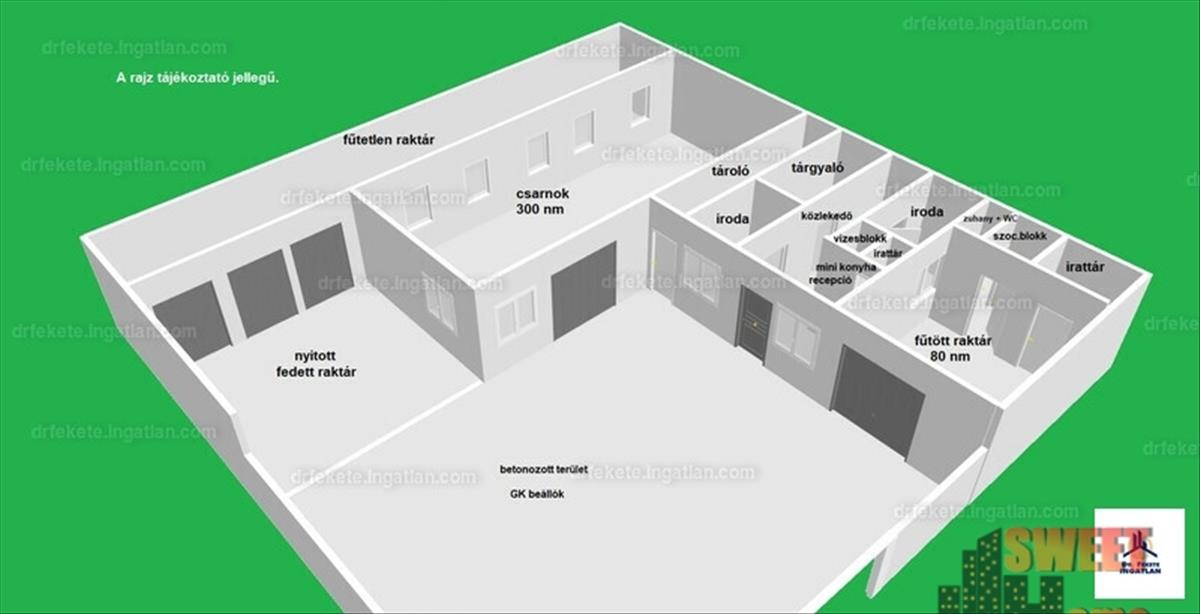 - 300 nm-es, 5 m belmagasságú, 3. 6 M -es ipari kapuval rendelkező, kéregerősített betonalapú targoncázható aljzatú, vizes blokkal is ellátott raktár