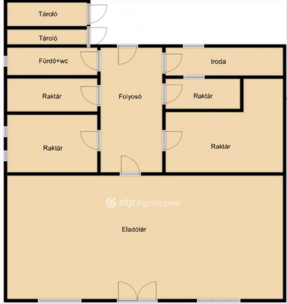 -a beltérben : eladótér, 4 raktár, tároló, iroda, folyosó, szociális helyiség található.
