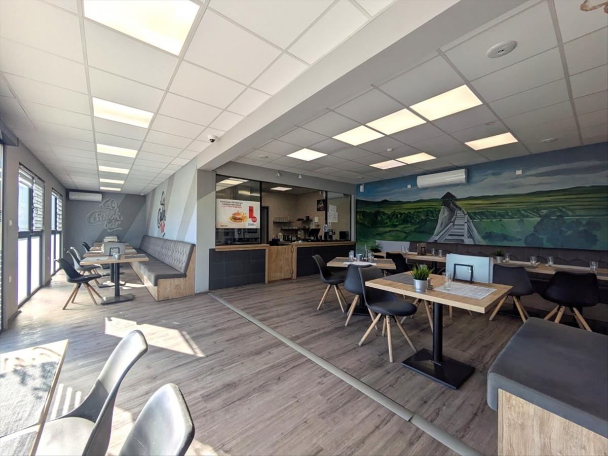 ÉTTEREM: Szendvicspanel szerkezetű, 131 négyzetméteres épület teljes felszereléssel, látványkonyha jellegű megoldással, modern, minőségi konyhai berendezésekkel.