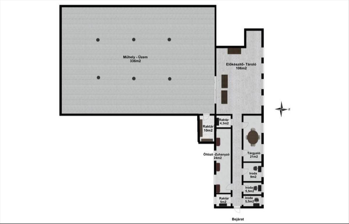 - üzem/műhely: 336 m2