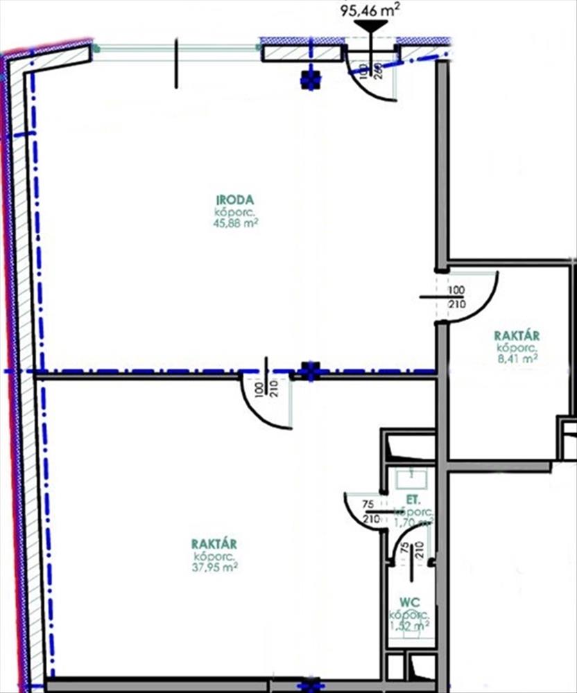A modern iroda 95, 46 nm-es, 3 helyiségből és szociális blokkból áll.