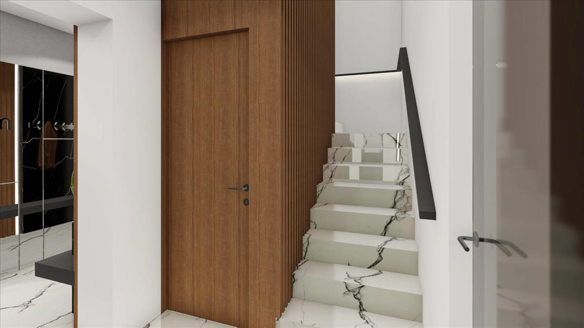Kényelmes elosztású, ergonomikus lépcső az ingatlanon kívül és belül is. a belső közlekedés a szintek között lépcsővel a garázsig megoldva. Az alagsor minőségi dupla Hörmann elektromos garázsajtóval ellátott teremgarázs.