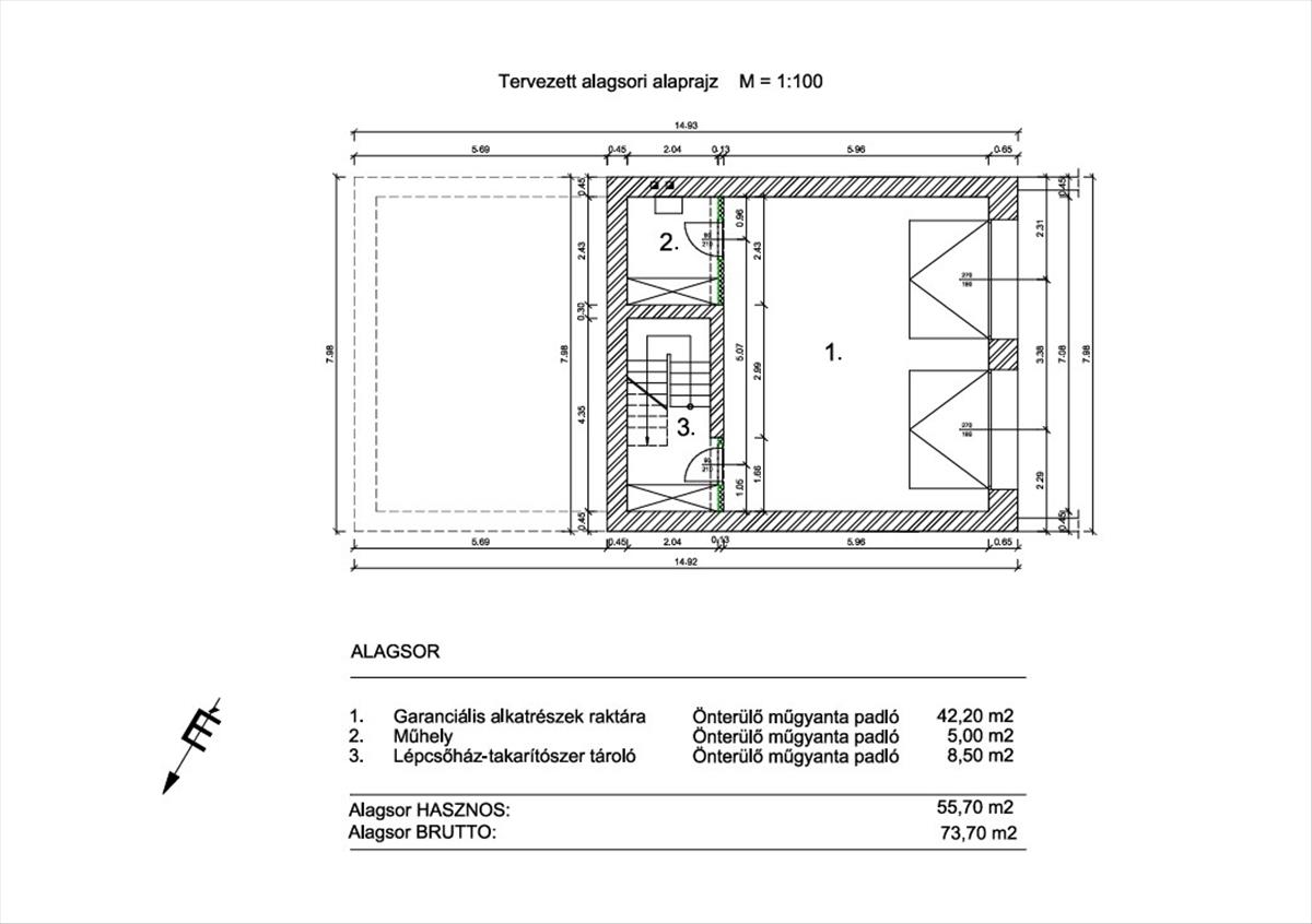 Tágas alsó szint, irodahelyiséggel, teakonyhával, tárgyalóval, előtérrel/váróval, illetve külön szeparált férfi/női mosdóval.