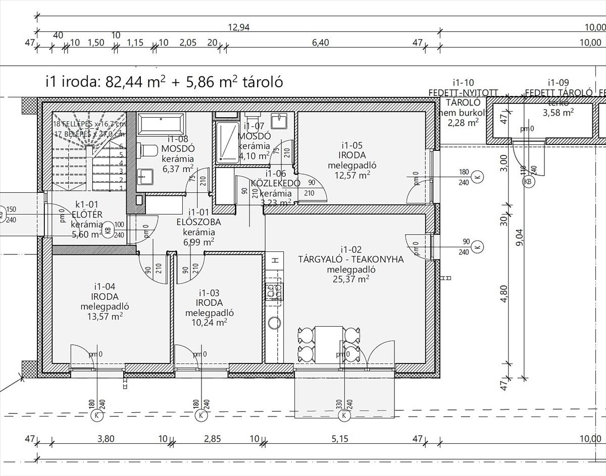 - Előszoba, tárgyaló-teakonyha, 3 irodahelyiség, közlekedő, 2 mosdó + 5, 86nm tároló