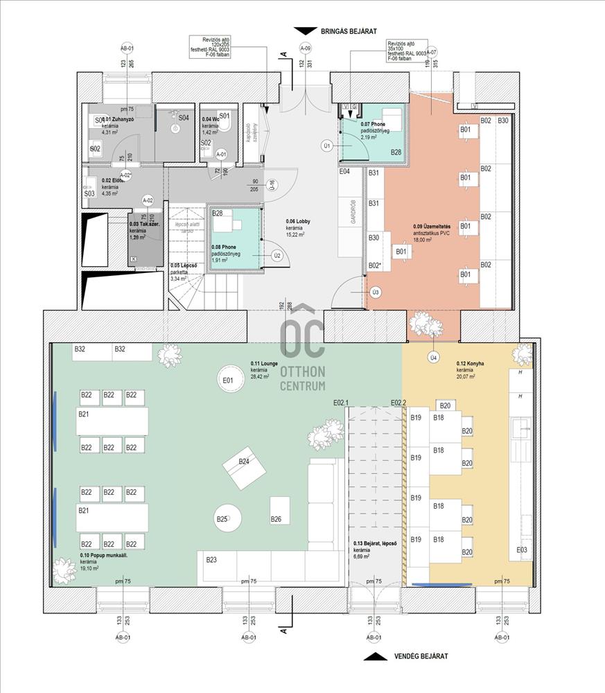 Az ingatlan a társasház magasföldszintjén és az 1. emeleten található, a két szintet belső lépcső köti össze. Az ingatlan magasföldszinti része úgy lett felújítva, hogy közvetlen utcai bejárat nyitható. a bejárat kinyitására településképi engedély beszerzése van folyamatban.