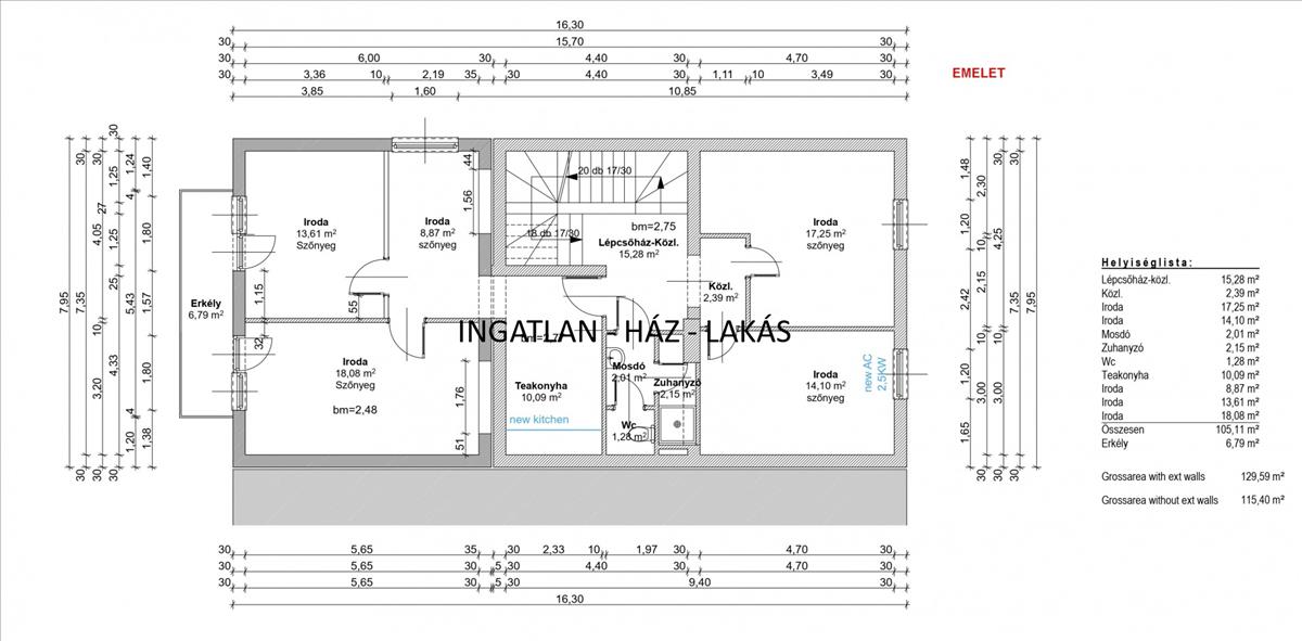 I. emelet: 130m2 (5 db iroda, teakonyha, mosdó, zuhanyzó, erkély)