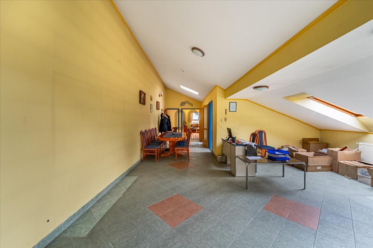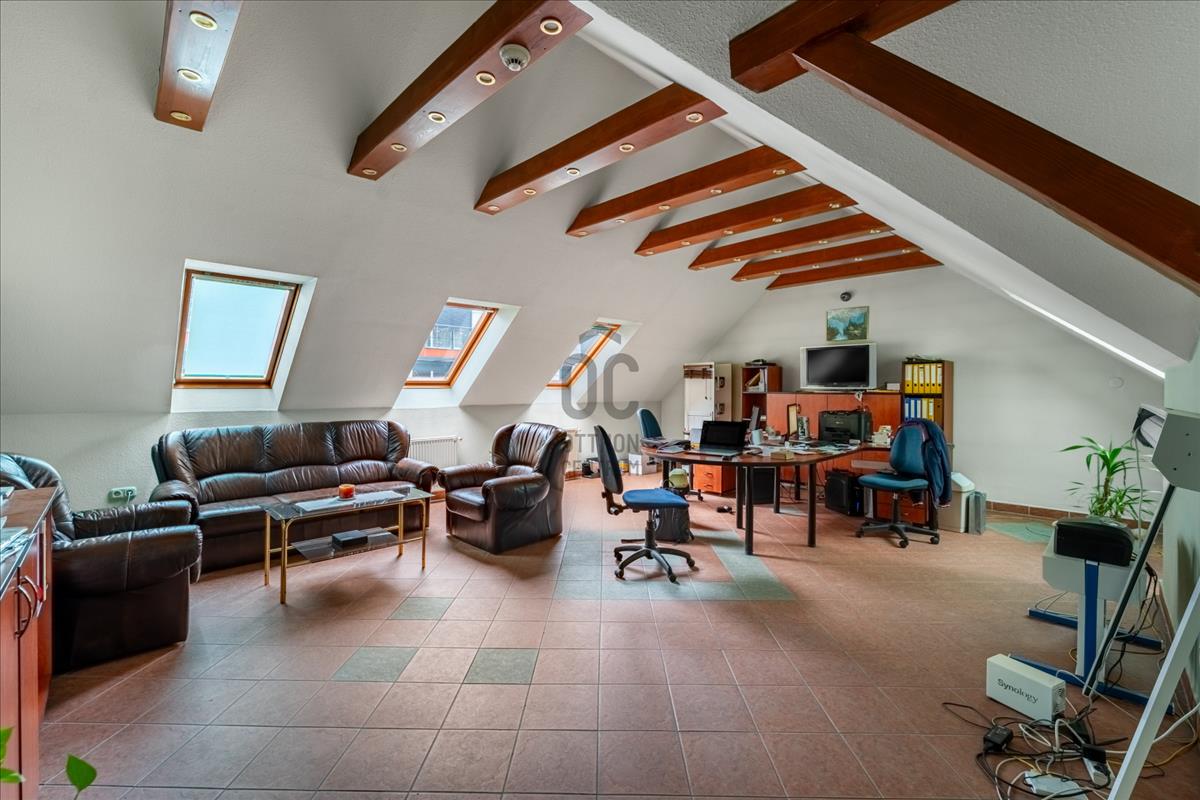 A félnyeregtetős, 3, 5 m csúcsmagasságú beépített tetőtéren egy nagyobb irodai helyiség, egy fürdőszoba, egy konyha, illetve üzemi funkciókra alkalmas tér található.
