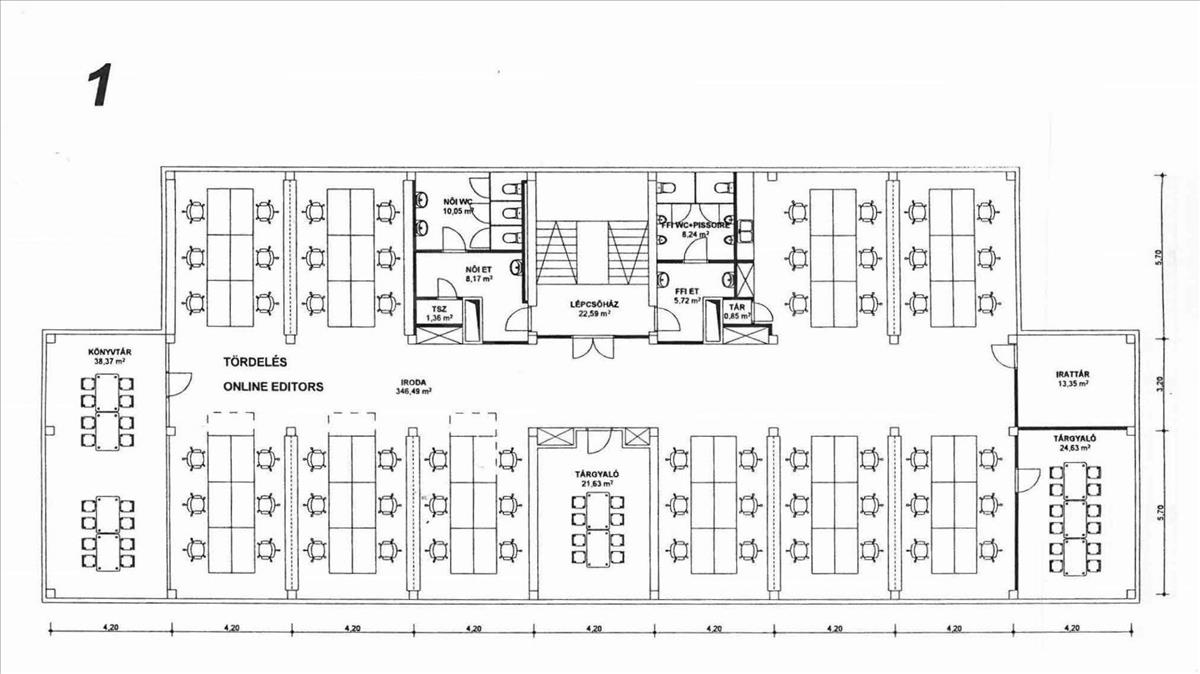 Alapterülete tulajdoni lap szerint 506 m², ezen a területen kialakított irodák összes hasznos alapterülete 2591 m².