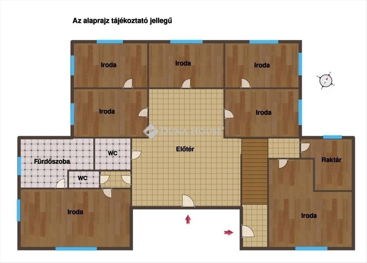 A 218 m²-es földszint irodai funkcióra kialakított, több helyiséggel, előtérrel, raktárral, teakonyhával, valamint női, férfi és mozgássérült mosdókkal. a 137 m²-es tetőtér önálló bejáratú lakrész, amelyben nappali, konyha, étkező és négy, saját fürdőszobás szoba található, így kiváló lehetőség lakhatási célú bérbeadásra, apartmanok kialakítására vagy munkásszállásként történő hasznosításra.