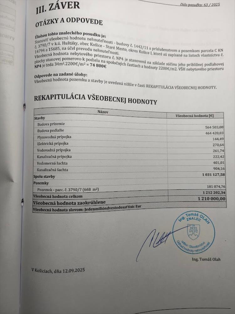 Értékbecslés szerinti forgalmi érték: 1 135 000 eur (a pizzéria nélkül)