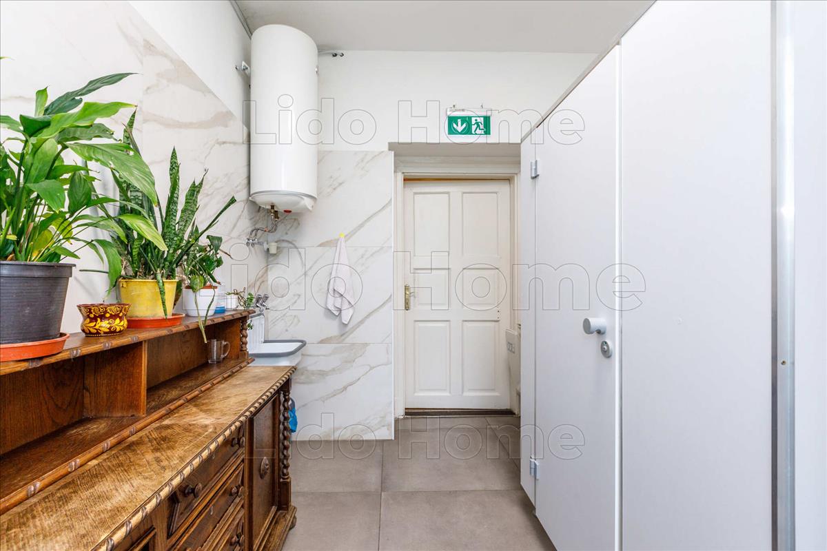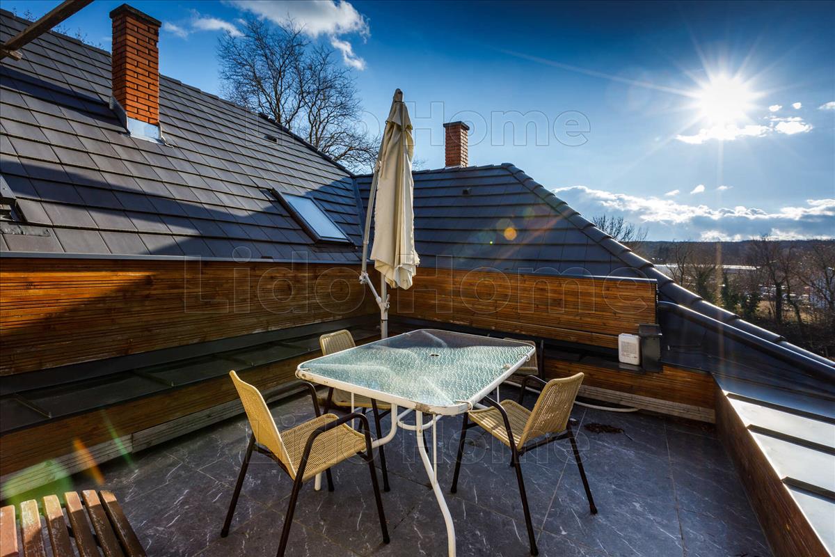 1. a legfelső szinten egy 220 nm -es magas minőségen megépített lakás található amerikai konyhás nappali 70 nm , (4 hálószoba és még további kialakítható) hálószoba 35 nm , gardrób 10 nm , fsz, wc; szoba 20 nm fsz 5 nm ; szoba 25 nm , fsz 5 nm ; szoba 15 nm ; szoba 15 nm ; mosókonyha 5 nm , közlekedők. a lakás extrája a 2 X 20 nm -es tetőterasz a lombkorona magasságában, amely jól látható a drónfotókon.