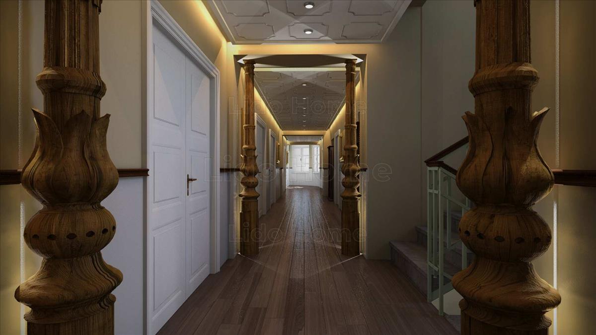 5. a nagyterem, az első és második emeleten a folyosó álmennyezete szilfa díszburkolat.