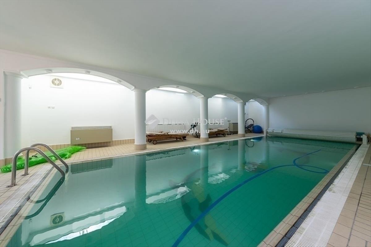 Egy szinttel még lejjebb a kert szinten wellness részleg: fűtött vízforgatós, ellenáramoltatóval felszerelt 10mx4m medence (alatta gépház szint), öltöző, tároló és fürdőszoba, teljes szélességében eltolható üvegajtókkal megnyitva a hangulatos, napos, szépen gondozott, magas tujákkal körbevett kertre.