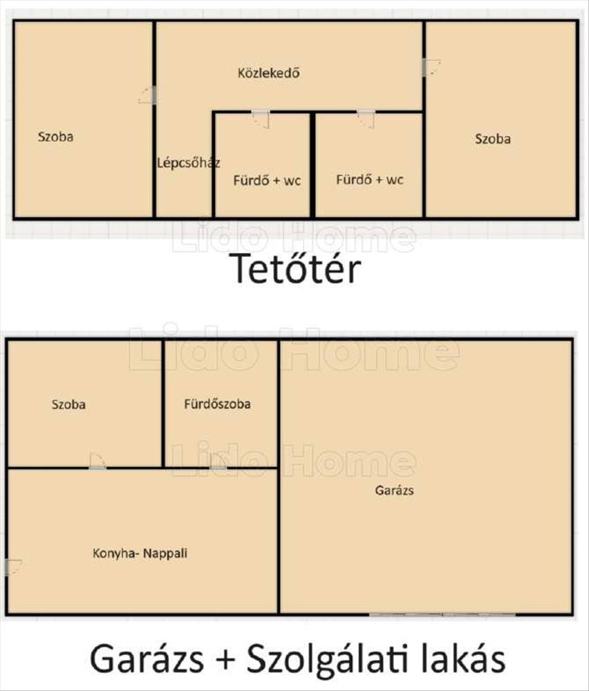 -Tetőtér (60 m²): kényelmes falépcsőn közelíthető meg; itt két hálószoba található, mindkettő saját fürdővel és WC-vel.