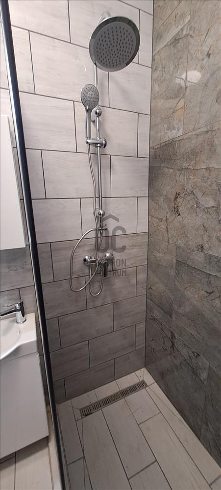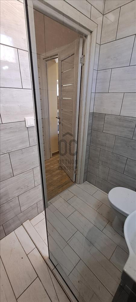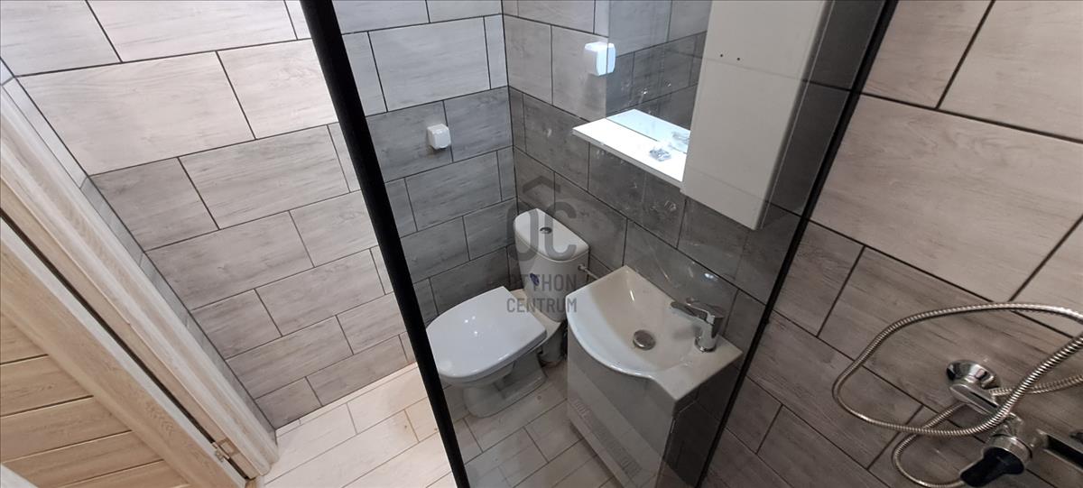 A fürdőszoba mosdóval, tuskabinnal és WC-vel felszerelt.