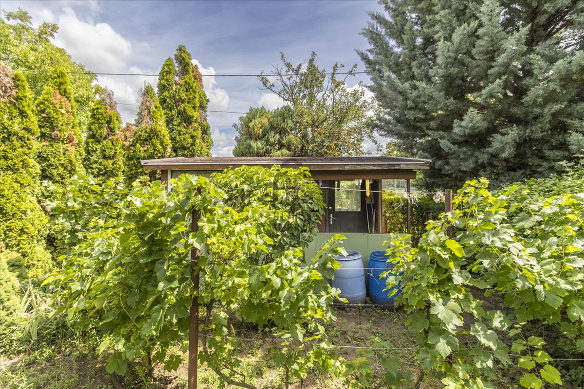 A terület elején egy 12 m²-es faház található, a hátsó részen egy pince és egy tároló van.