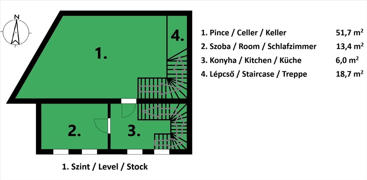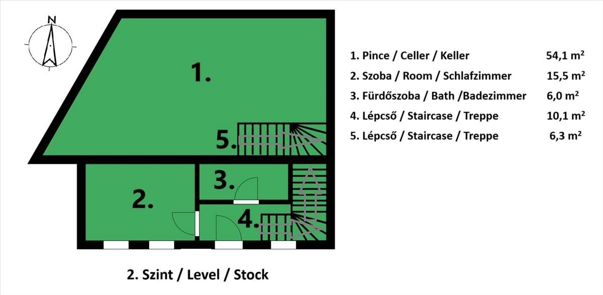Tároló: kb. 30 M²-es pincehelyiség, mindkét szintről közvetlenül megközelíthető
