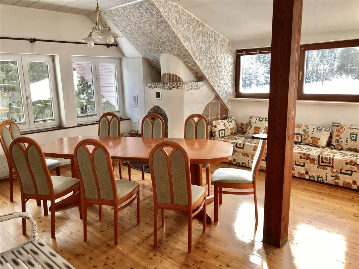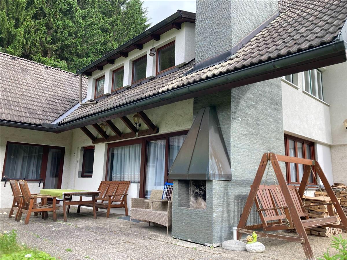 The apartment comes with covered parking, terraces, a garden pond, a small wooden house, and a separate cellar. The landscaped, well-maintained garden and peaceful surroundings offer ideal conditions for relaxation, while the area provides plenty of opportunities for active recreation, such as skiing, hiking, and cycling. The property can easily be converted into two apartments, offering comfortable accommodation for multiple families.
