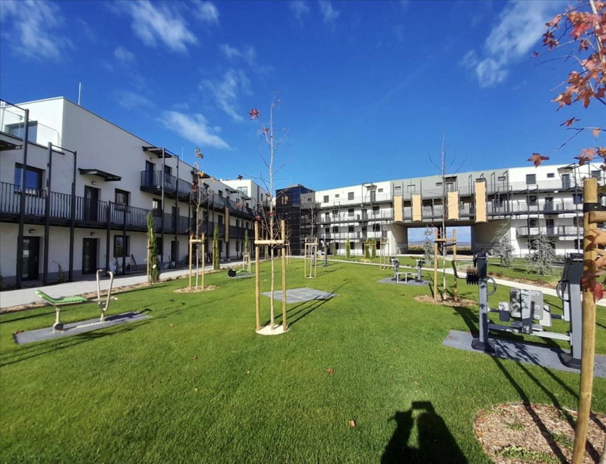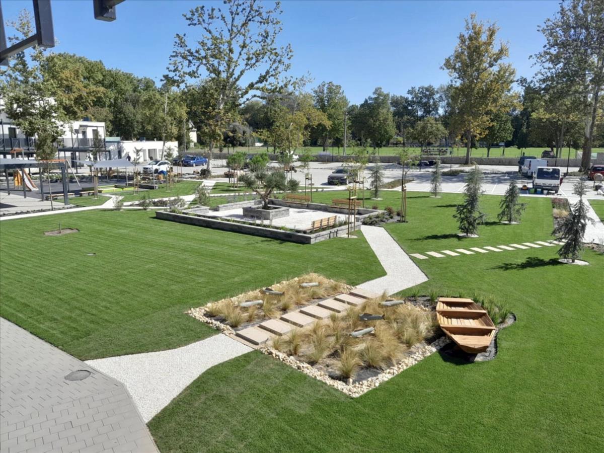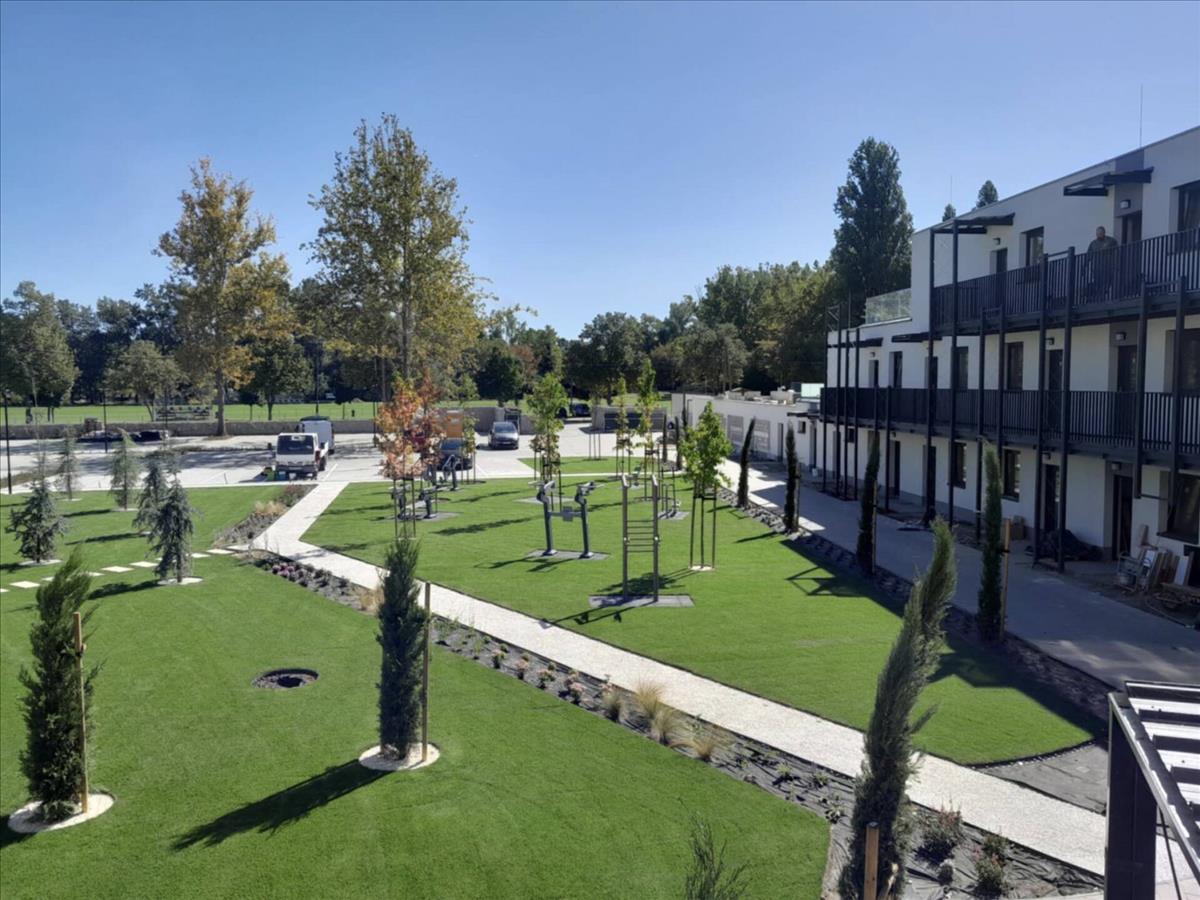 A közös parkban többfunkciós edzőgépek vannak kialakítva, gyerekeknek külön játszótér áll rendelkezésükre.