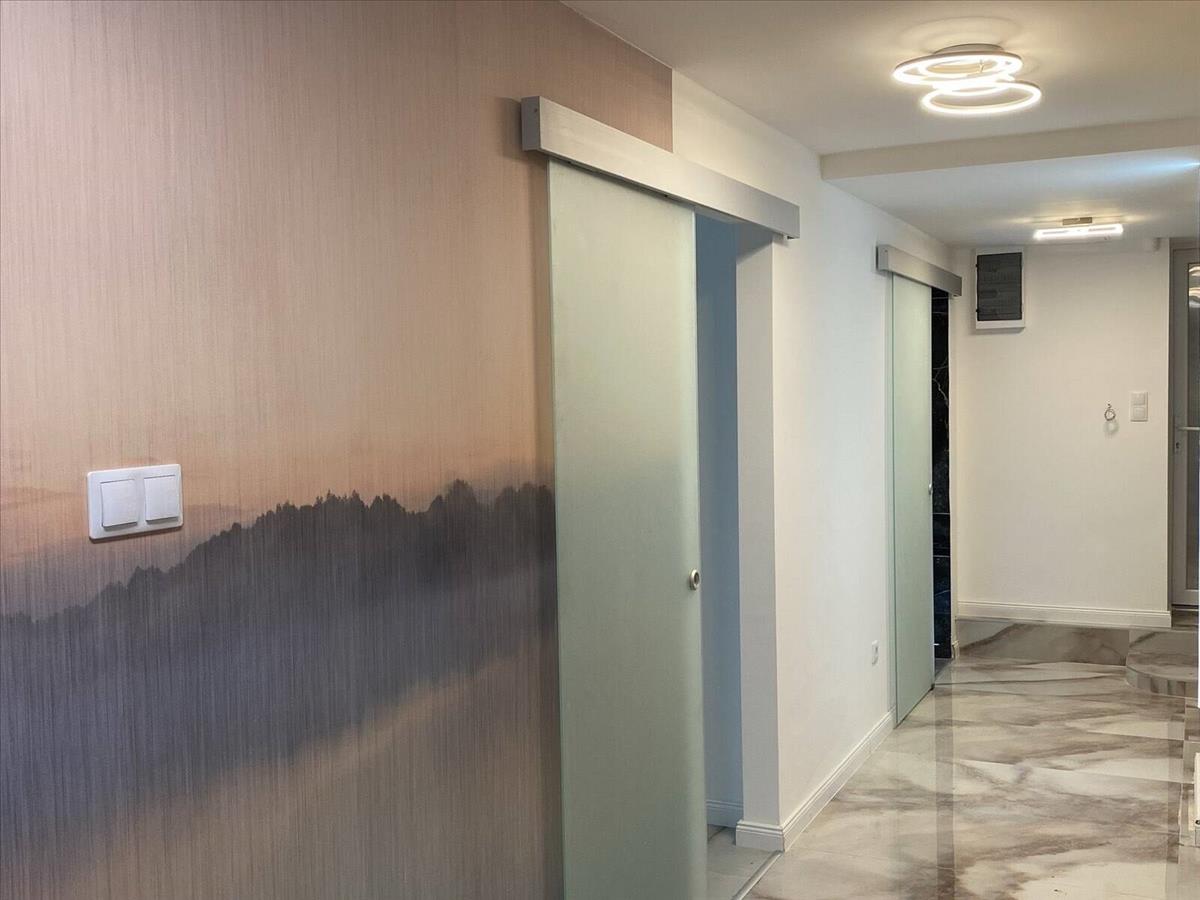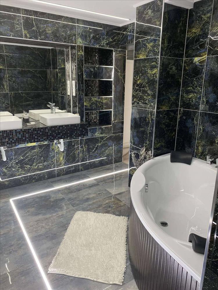 A lakás egyik legnagyobb értéke a látványos, exkluzív kialakítású fürdőszoba, amely egyedi burkolataival és hangulatával szinte spa élményt nyújt. Kád és épített zuhanyzó egyaránt helyet kapott, a helyiség pedig két irányból is megközelíthető, így a hálószobából és a közlekedőből is nyílik.