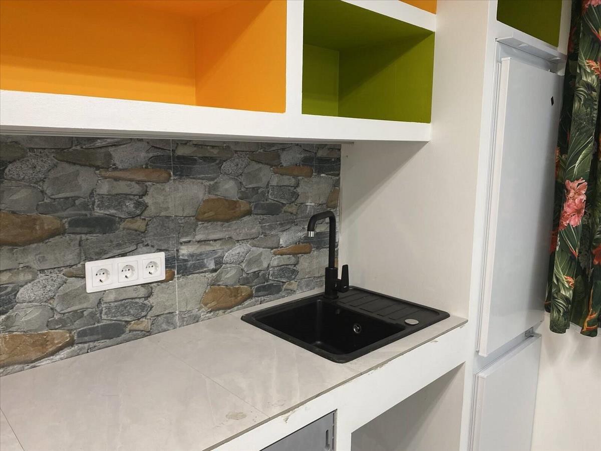 A konyha beépített hűtővel, mikróval, mosogatógéppel, sütővel és főzőlappal felszerelt, kialakítása praktikus.