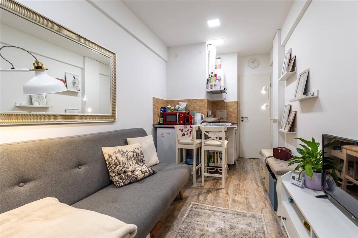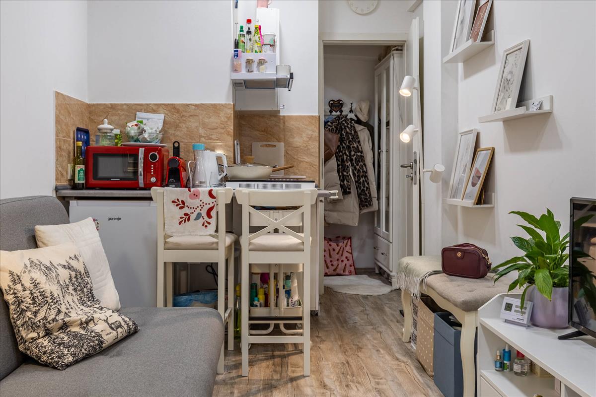Az ingatlanunkba belépve a haló/nappali részbe érkezünk, ahol a konyha is elhelyezkedik. Egy kis közlekedőn keresztül érjük el a nyílászáróval szerelt zuhanyzós fürdőszobát.