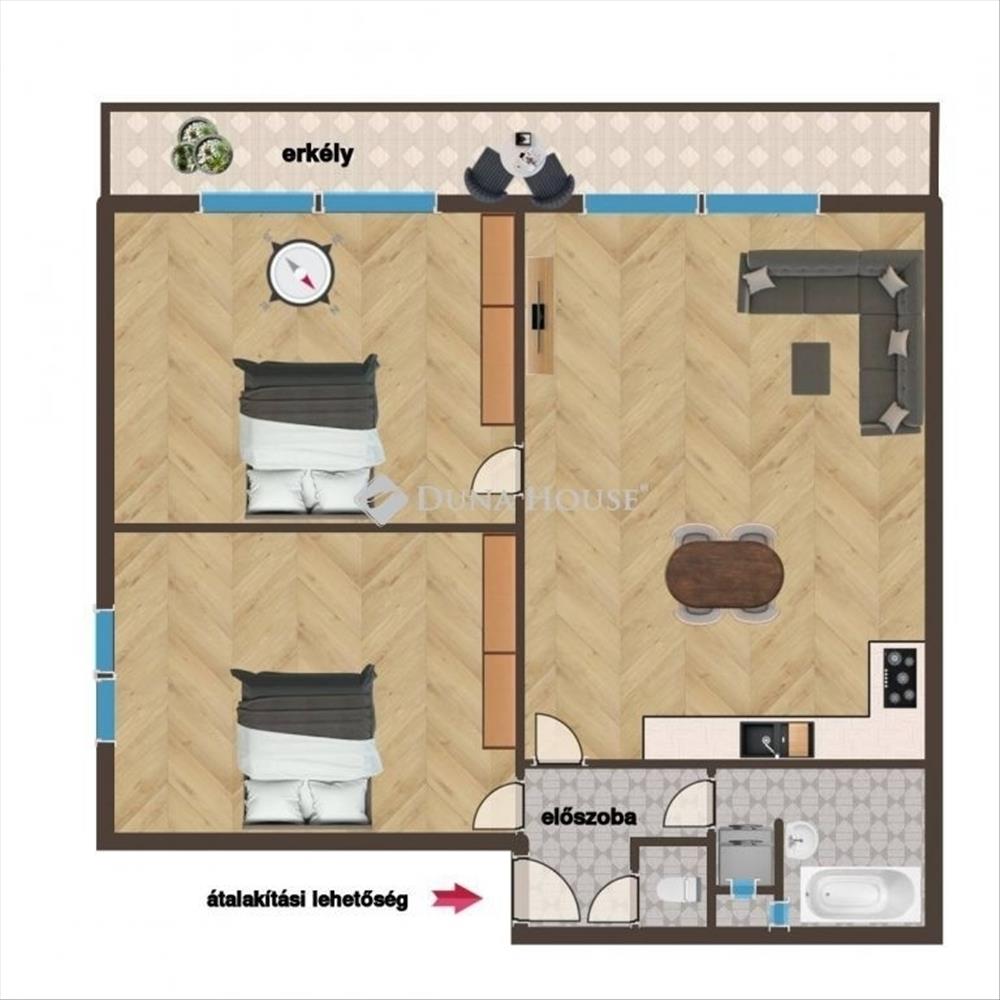 A lakás délnyugati tájolású, egész nap világos. Jelenlegi elrendezése 2 szoba + külön konyha és étkező, de könnyedén átalakítható amerikai konyhás nappali + 2 hálószobássá. Jó állapotú, 2 éve felújított konyhával és beépített gépekkel, műanyag nyílászárókkal, réz villanyvezetékekkel, felcsiszolt tölgyfa parkettával, klímával és redőnyökkel.