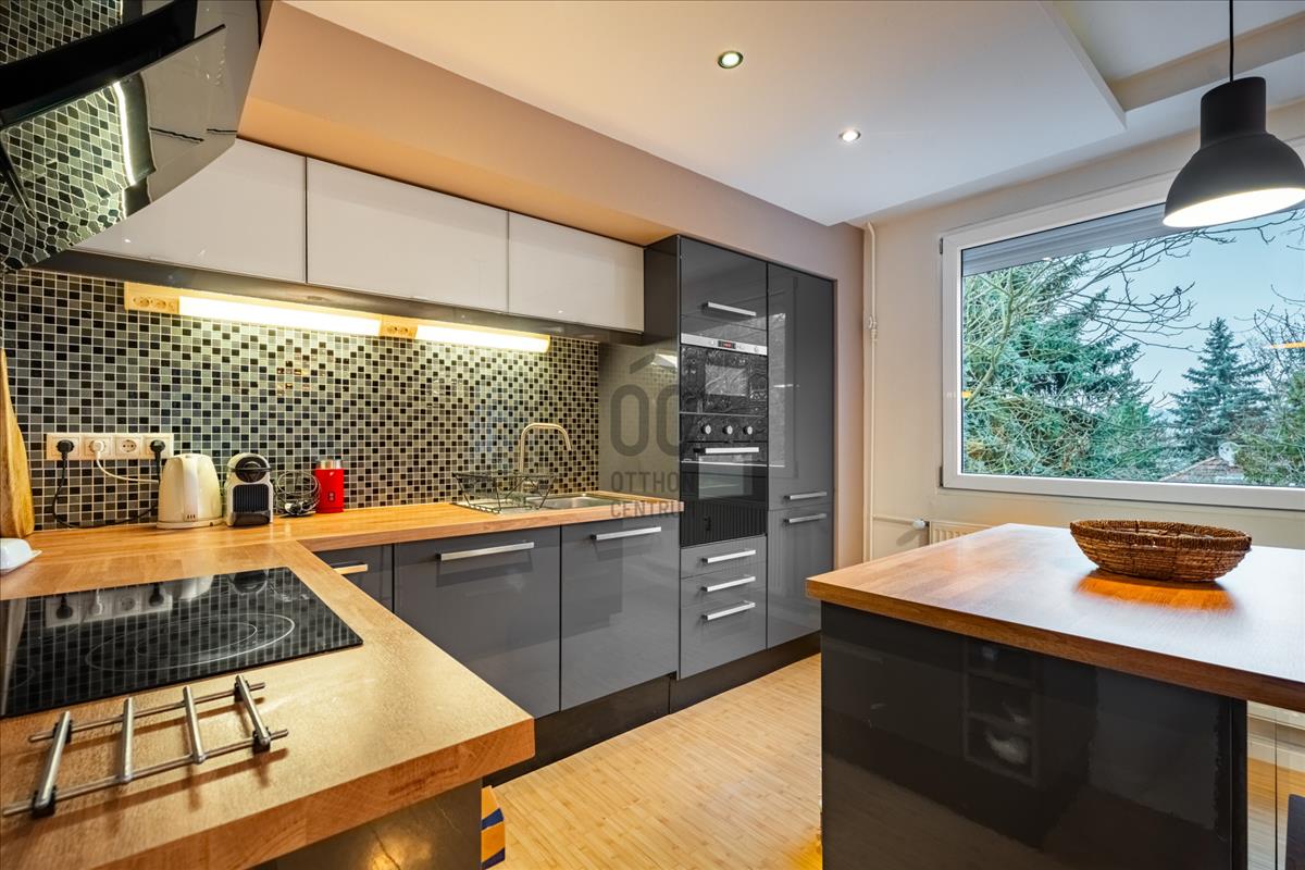 Eladó egy napfényes, tágas lakás a Mátyás hegy oldalában. Mivel a lakás a társasház sarkában helyezkedik el, így az amerikai konyhás nappaliba délről és nyugatról is besüt a nap.