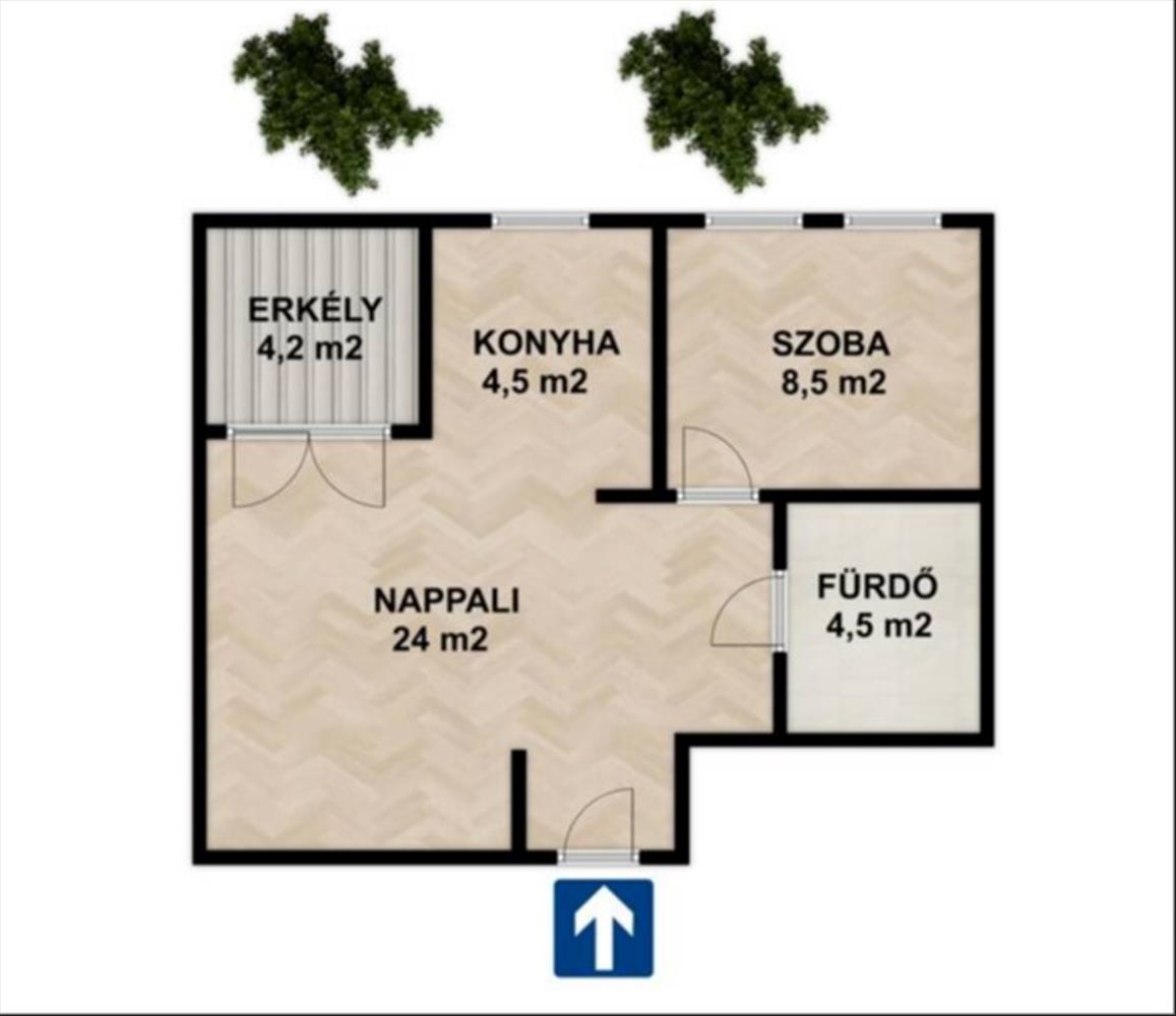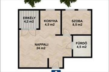 Helyiségei: Előszoba, fürdőszoba, 1 hálószoba, nappali amerikai konyhával.