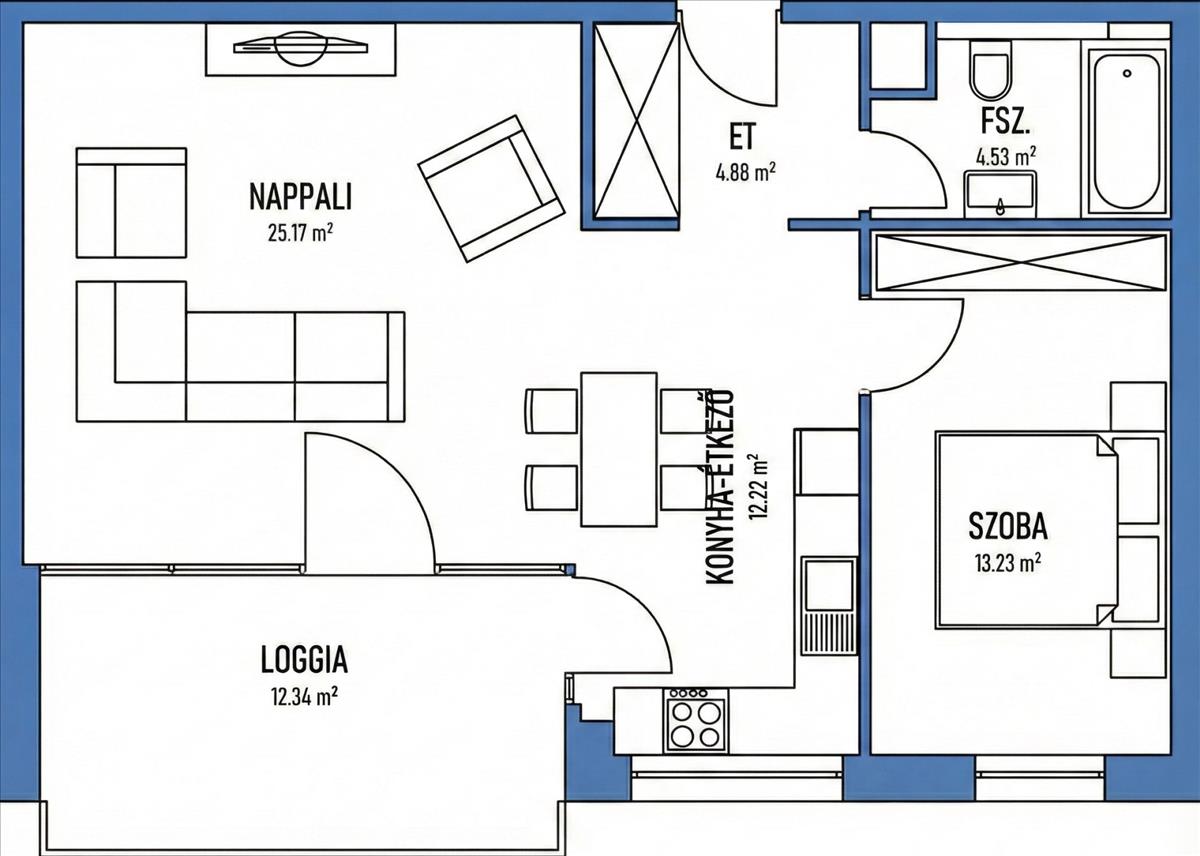 • 64–67 m² + loggia (nappali + 2 szoba)
