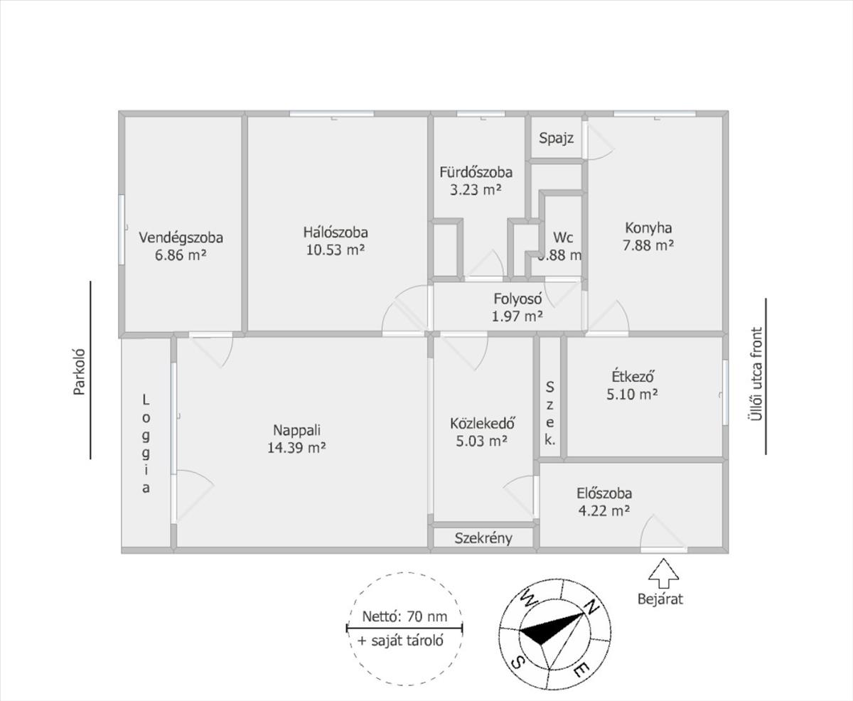 Az ingatlan egyik legnagyobb előnye a praktikusság. a nappali és a vendégszoba déli tájolású, így világos, napfényes életteret biztosítanak, míg a hálószoba és a konyha nyugati fekvésű, ami kellemes, kiegyensúlyozott hőérzetet ad a mindennapokban. a lakáshoz tartozik egy 3 m²-es loggia, amely jól használható kiegészítő térként, valamint egy saját tárolóhelyiség, ami jelentős előnyt jelent a mindennapi használat során.