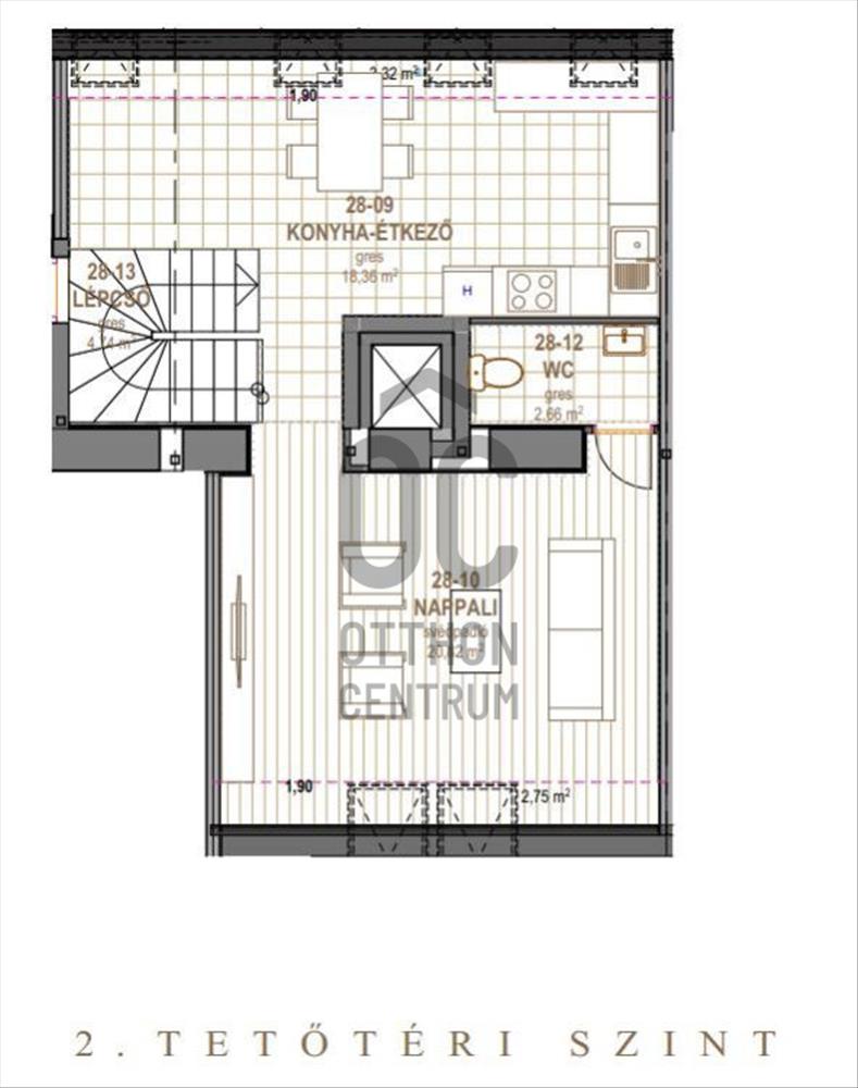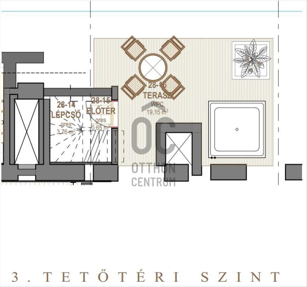 Kedvező beosztású, az előtérből és a közlekedőből nyílik a három szoba. Az alsó szinten kerül kialakításra a fürdő és egy külön wc, zuhanyzó mely a hálószobából nyílik közvetlenül. a tágas, világos nappali és a konyha a második szinten kerül kialakításra. a lakás legtetején a harmadik szinten található a nagy tetőterasz, melyen jacuzzi alakítható ki.