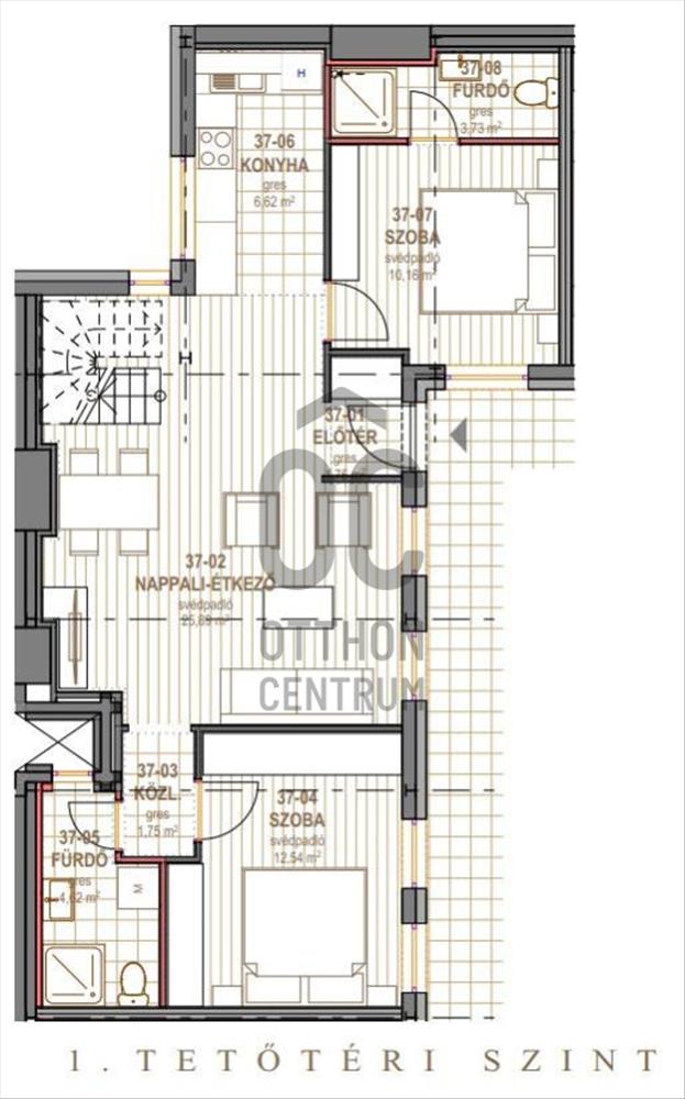 Tágas csendes, lakás nagy tetőterasszal. Az alsó szinten konyha, nappali és két hálószoba, a felső szinten terasz található. Az előtérből nyílik a 26 m2-es nappali étkezővel. a szeparált, de nem leválasztott konyha a nappaliból közelíthető meg. a két hálószoba egymástól jól szeparált, a nappaliból nyílnak, külön vizesblokk került kialakításra. a felső emeleten található a 33, 49 m2 alapterületű tetőterasz.