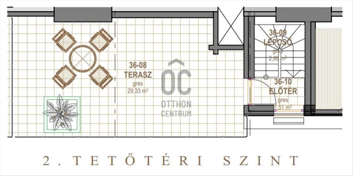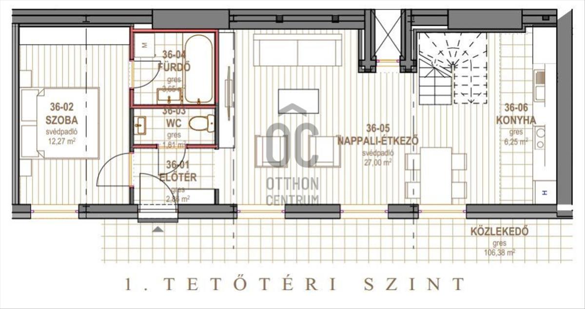 Kedvező beosztású, az alsó szinten a konyha, nappali és hálószoba, a felső szinten egy nagy tetőterasz található. Az előtértől balra a 12 m2-es hálószoba, jobbra a 27 m2-es tágas, világos nappali van, egy légtérben a konyha-étkezővel. a fürdő a hálószobából közelíthető meg, a toalett közvetlenül az előtérből nyílik.