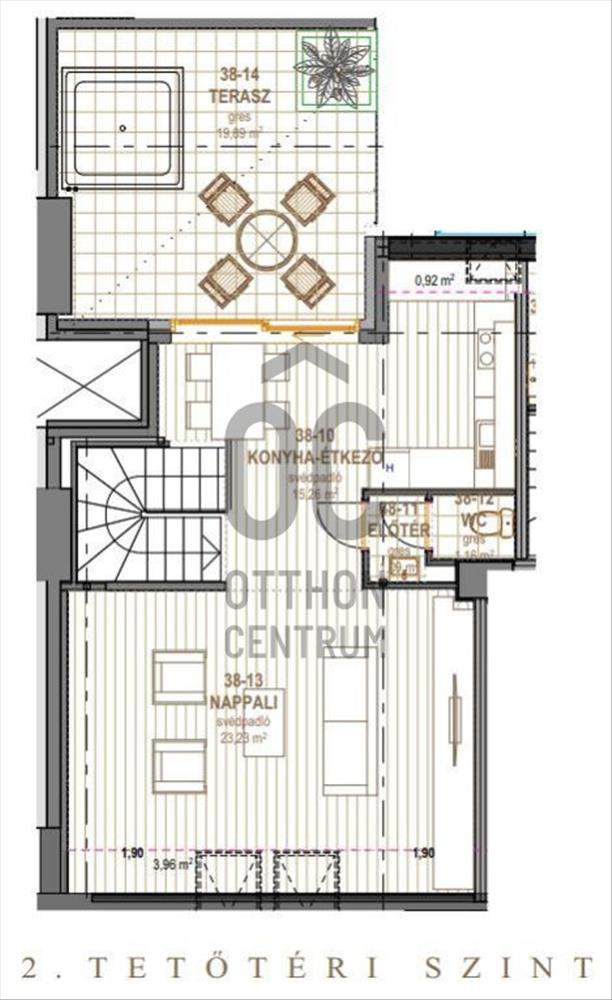 Kedvező beosztású, az alsó szinten három szoba vizesblokkokkal, a felső szinten konyha, nappali és tetőterasz található. Az alsó szinten, az előtérből és közlekedőből nyílnak az egymástól jól szeparált, közel azonos méretű szobák. a felső emeleten található a nappali és a konyha, egy vizesblokk itt is kialakításra került. a nagyméretű teraszra lehetőség van jacuzzi elhelyezésére.