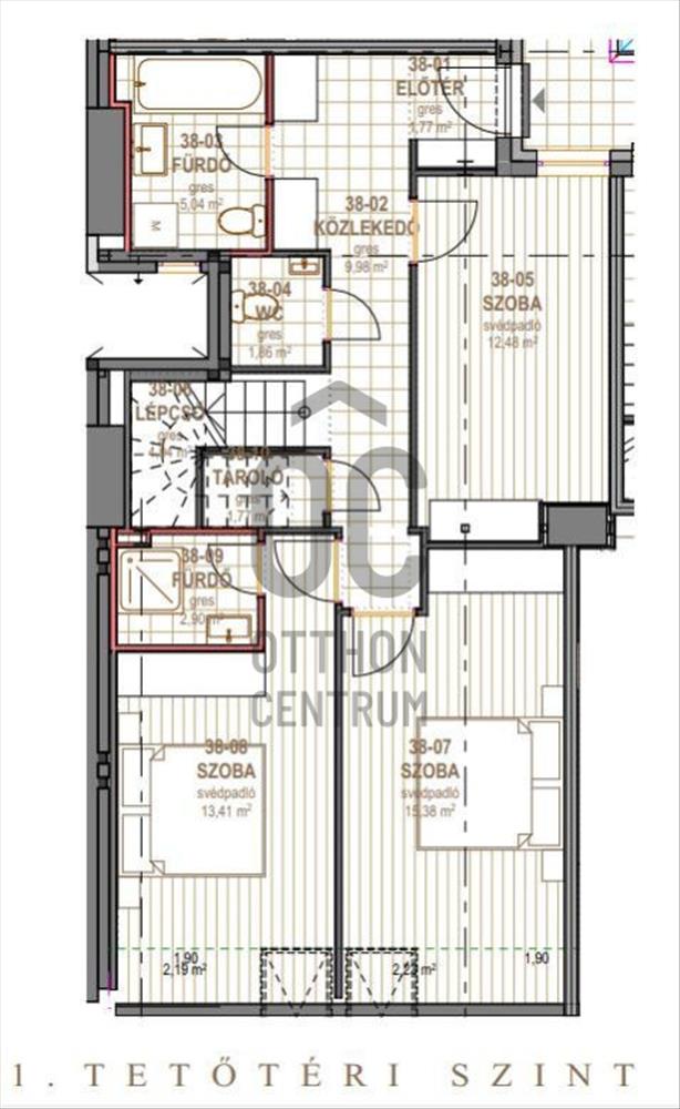 A teraszok, és a függőfolyosók csúszásmentes fagyálló kerámia ill. Greslap burkolatúak, teljes felületű, üregmentes, flexibilis és fagyálló ragasztással.