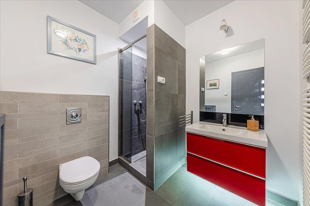 Egyenes tovább haladva egy nagy szoba- nappali rész következik, mely tökéletes helyszíne a közösségi életnek, illetve egy zuhanyzós fürdőszoba is kialakításra került, így nem kell az emeletre szaladgálni.