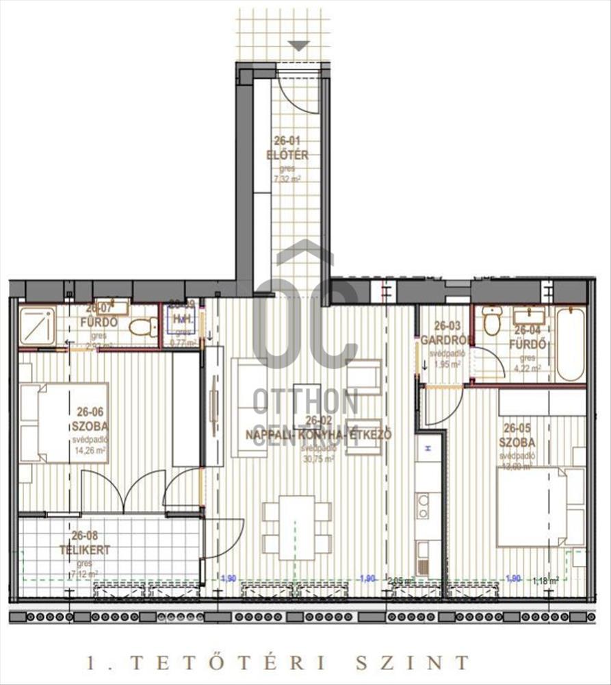Kedvező beosztású, az előtérből nyílik a nappali, a két hálószoba egymástól jól szeparált. Mindegyik hálószobához külön vizesblokk tartozik. a télikert kialakítása opcionálisan igényelhető.