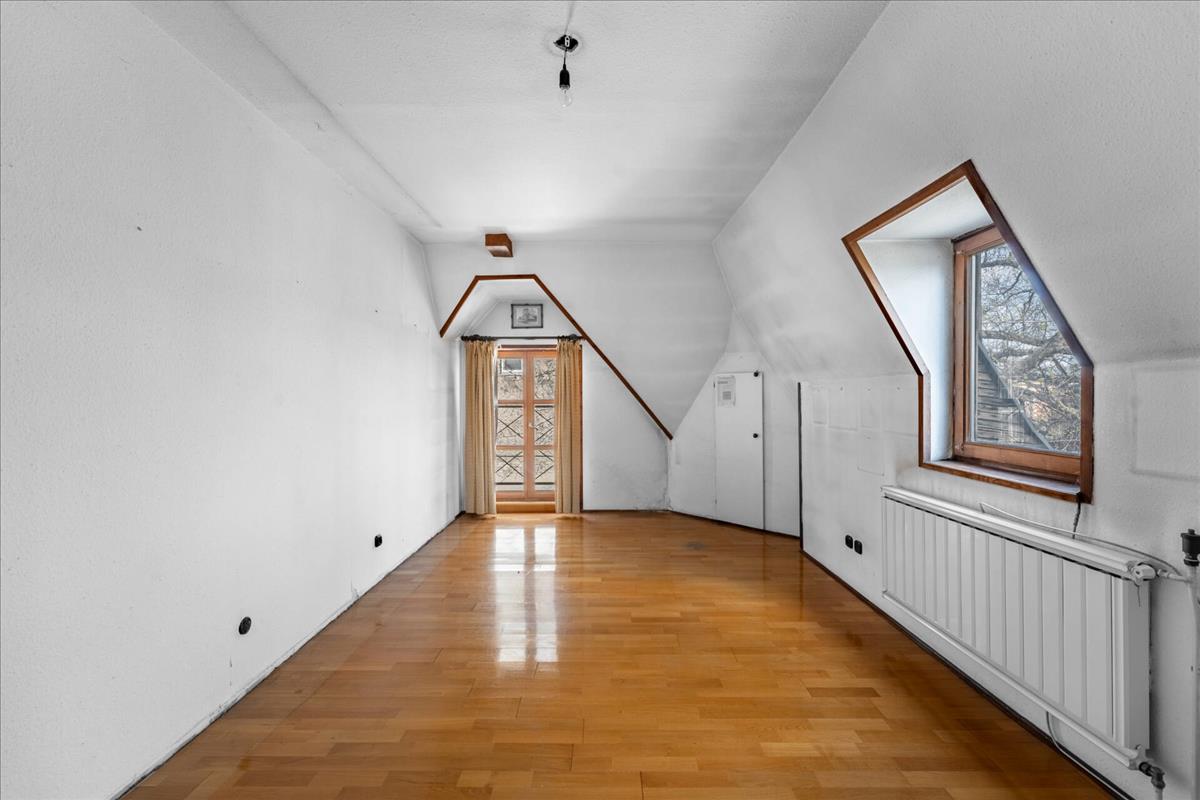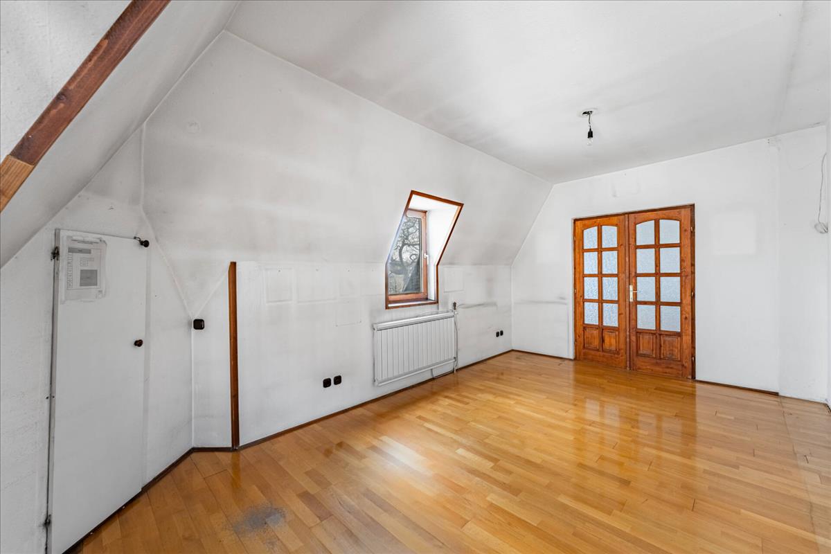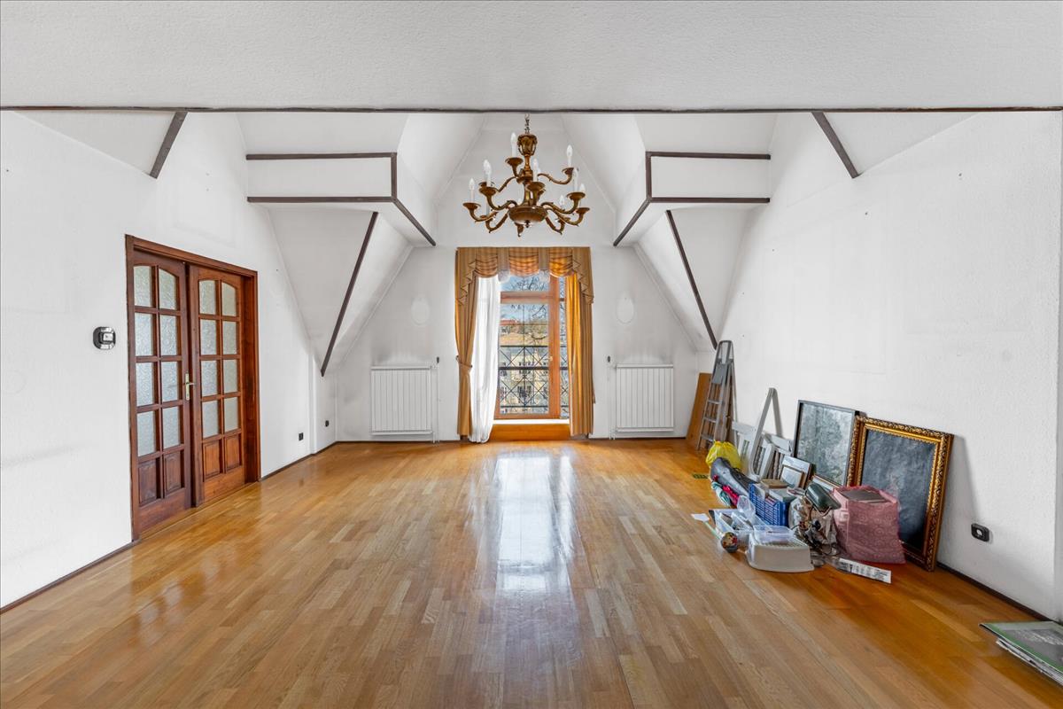 A bruttó 191 m²-es otthon különleges, karakteres tetőtéri kialakítást kapott, egyedi formájú ablakokkal, eredeti fa nyílászárókkal és díszítőelemekkel.