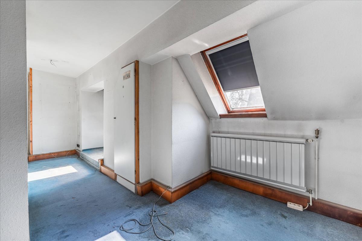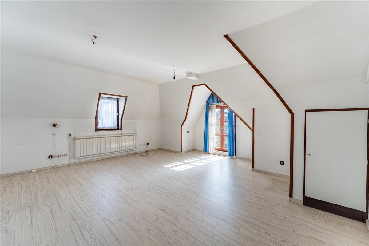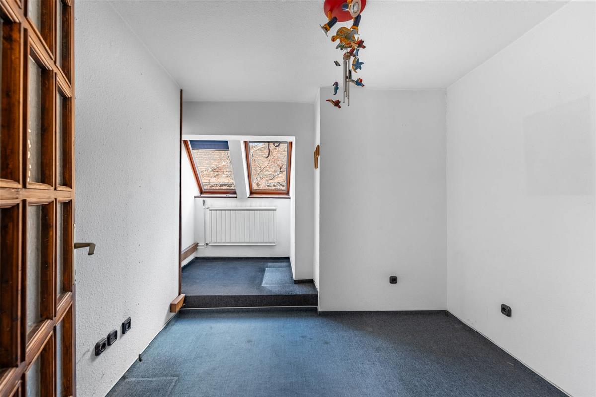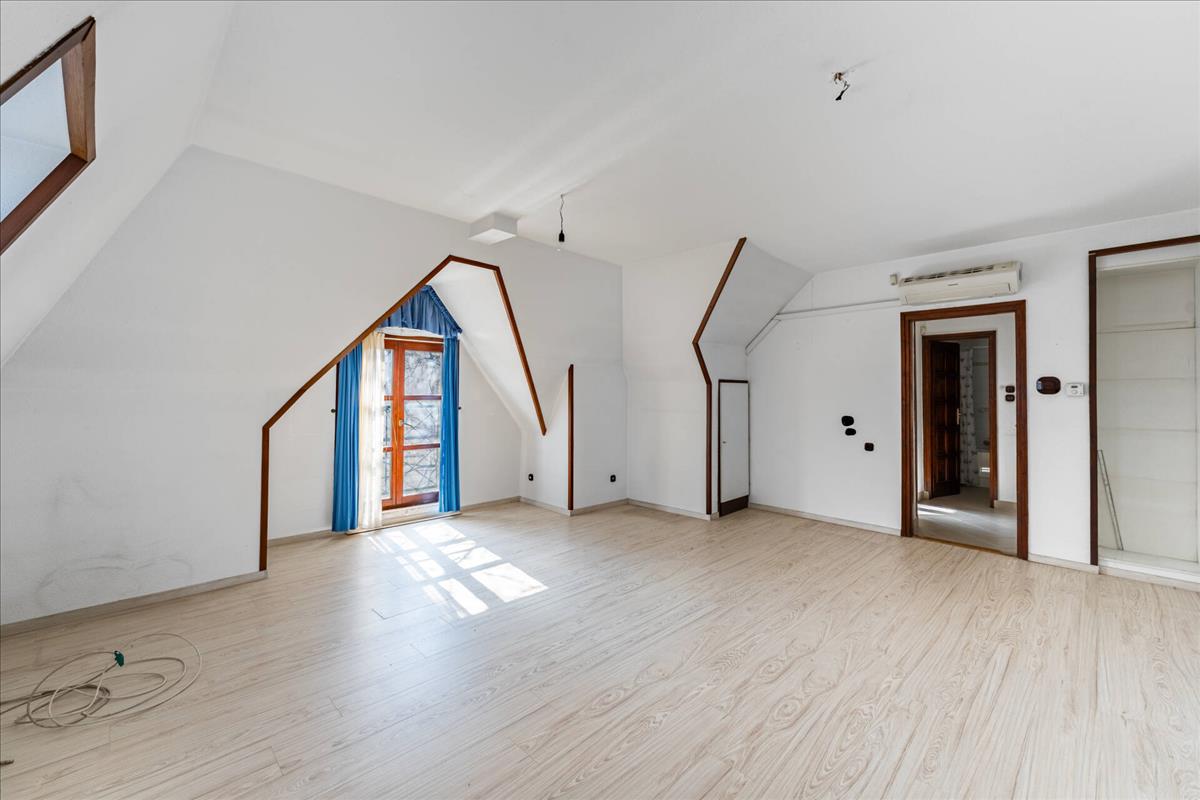 A bruttó 191 m²-es otthon különleges, karakteres tetőtéri kialakítást kapott, egyedi formájú ablakokkal, eredeti fa nyílászárókkal és díszítőelemekkel.