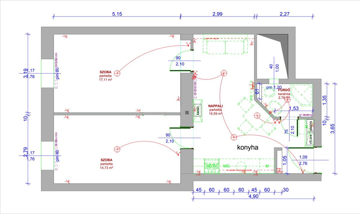 2 külön nyíló szoba, külön helyiségben amerikai konyha étkezővel és közös térrel (ami a nappali funkcióját is ellátja). Továbbá fürdő wc-vel (természetes szellőzés megoldott). a hálószobák mindegyike klimatizált. Konyha teljesen gépesítve, felszerelve.