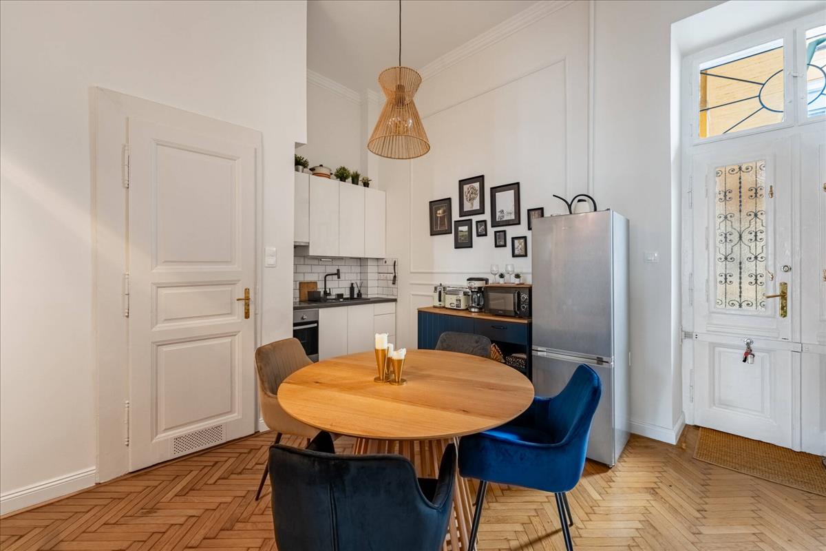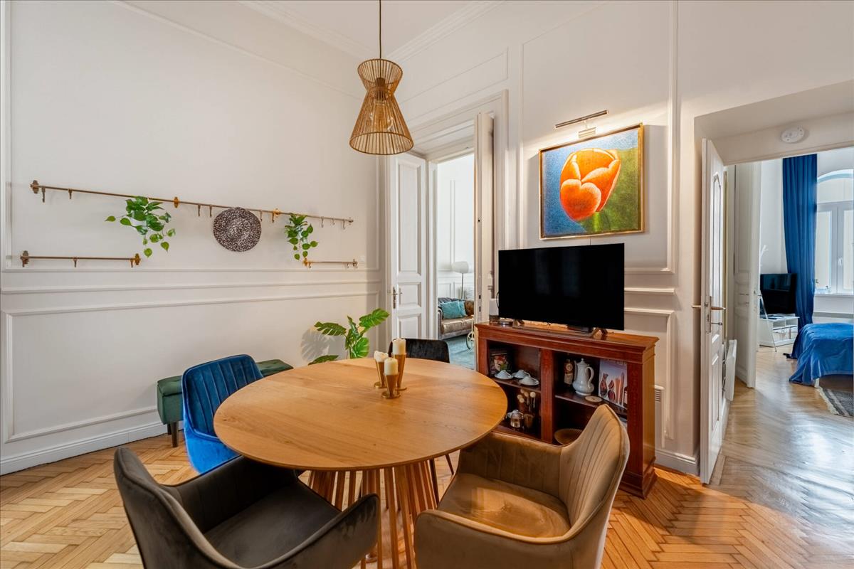 A lakás két polgári stílusú szobával és étkező–konyhával rendelkezik, a több mint 3 méteres belmagasság tágas, levegős érzetet biztosít.