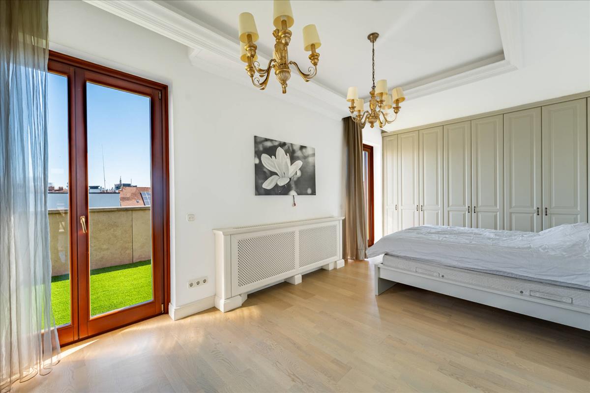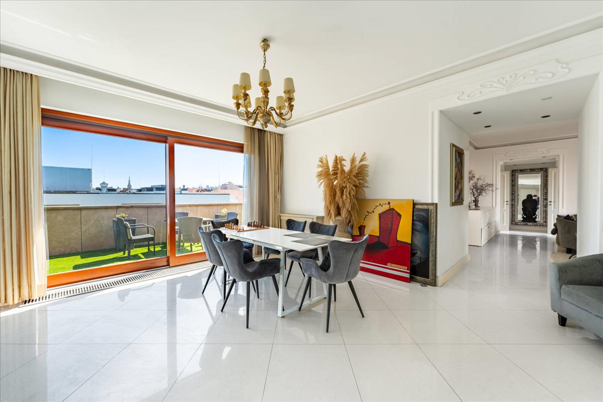 Megvételre kínáljuk ezt a 6. emeleti, 172 m²-es, 3 hálószobás, 3 fürdőszobás, egyedülálló 157 m2-es teraszkapcsolattal és dupla garázzsal rendelkező luxuslakást Budapest VII. kerületének egyik legkedveltebb részén, a Kazinczy utcában, a 2007-ben épült „Reneszánsz Házban”.
