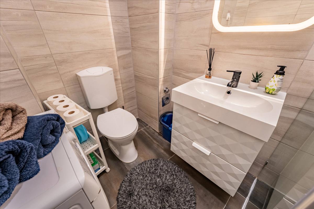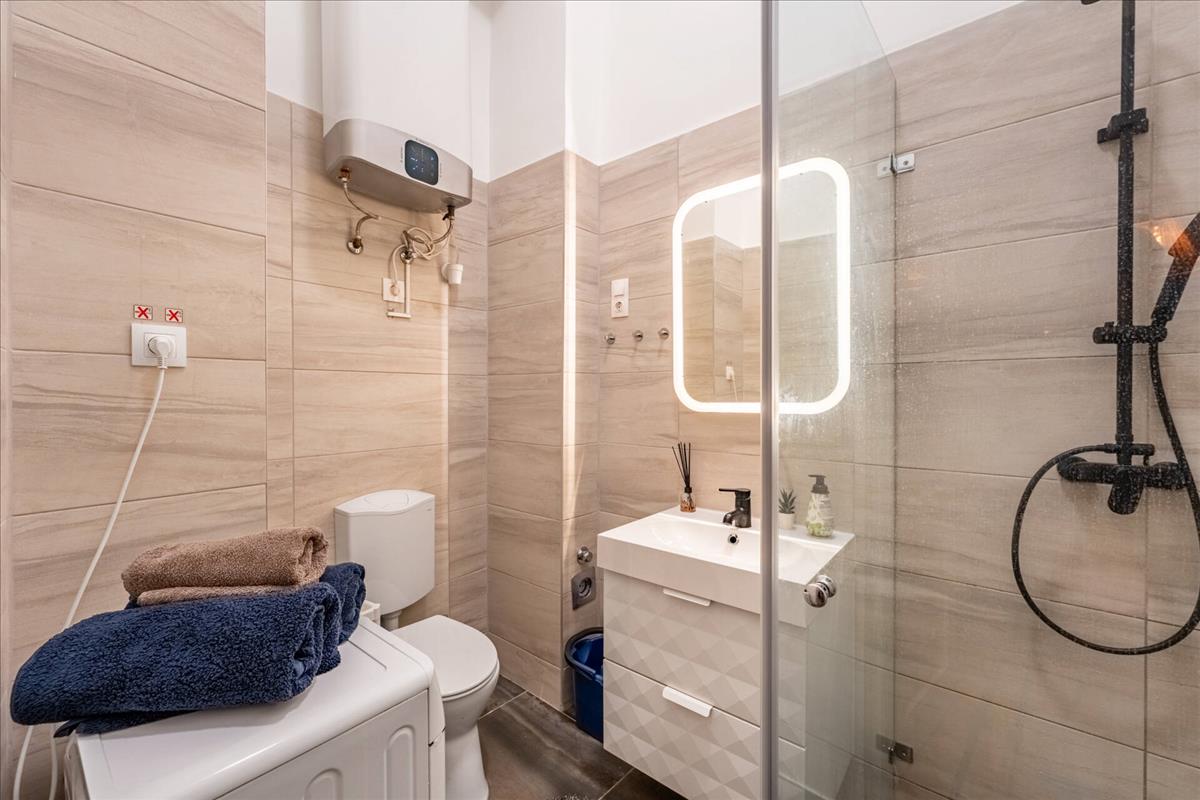 Az ingatlan felújított, klimatizált, elektromos fűtőpaneles fűtéssel rendelkezik, a fürdőszoba és a wc egy helyiségben található.