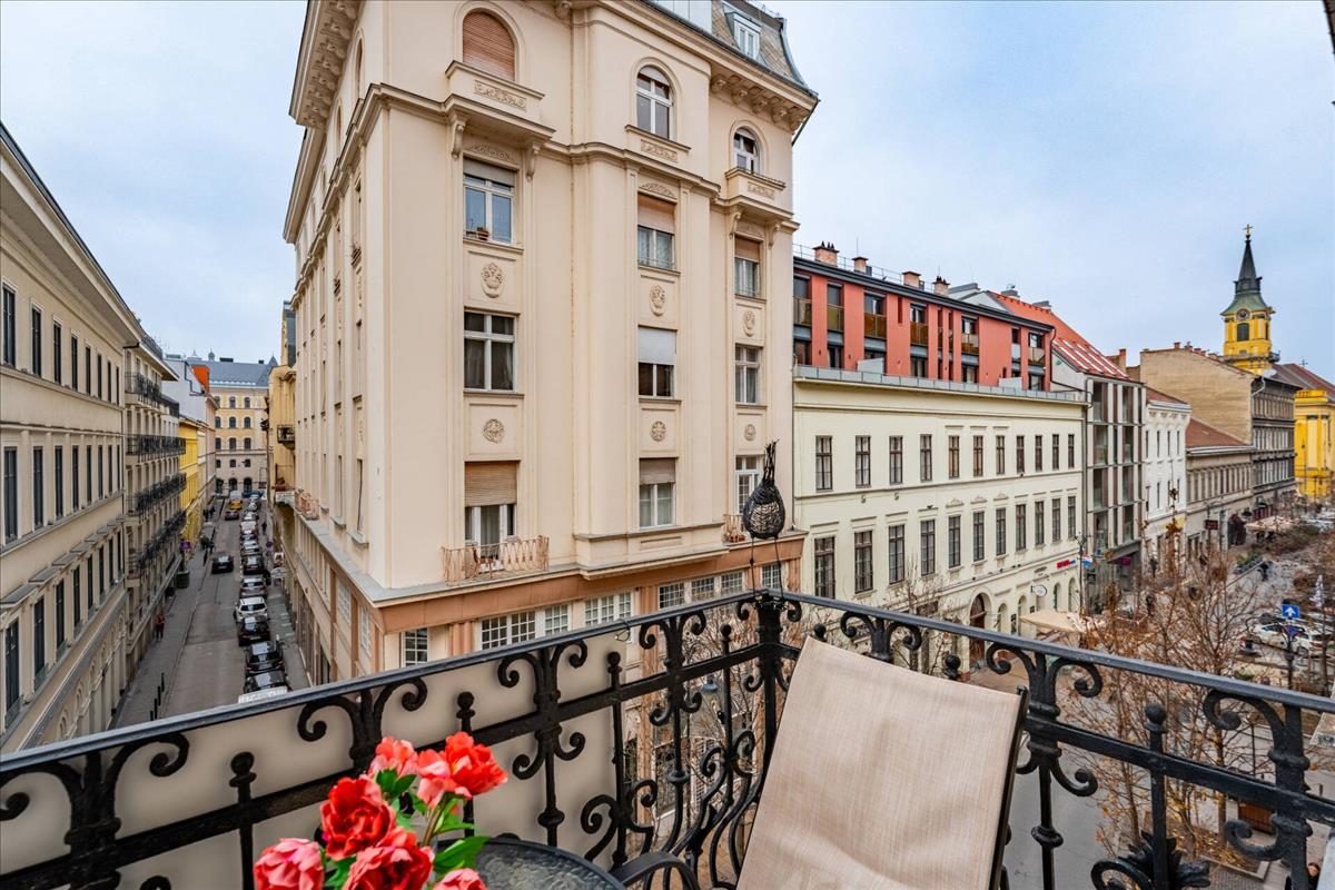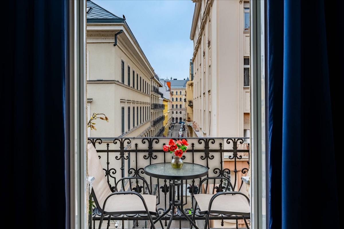 Az utcára néző erkély kellemes városi panorámát nyújt, kilátással az Andrássy úti W Budapest Hotel irányába és a Vasvári Pál utca teljes hosszára.