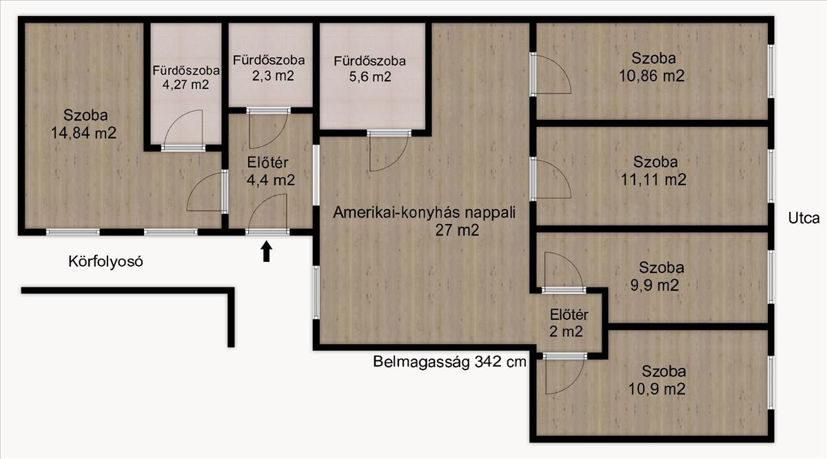 Az ingatlan elrendezése praktikus és jól kihasználható, a helyiségek arányosak és világosak.