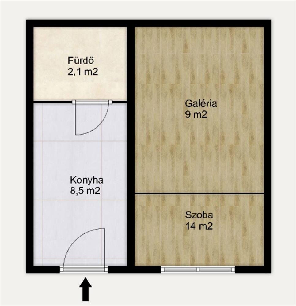 A lakás korszerű, műanyag bejárati ajtaján belépve a konyhába érkezünk, ahol egy kis étkezőasztal is elfér. a helyiség végén alakították ki a zuhanyzóval felszerelt fürdőszobát, mely fölött egy tárolásra, de akár alvásra is alkalmas galériát építettek. a laminált padlóval burkolt szobában szintén készítettek egy impozáns méretű galériát, mely nem csak hálóhelyiségként, de tárolószekrények elhelyezésével akár gardróbnak is használható.