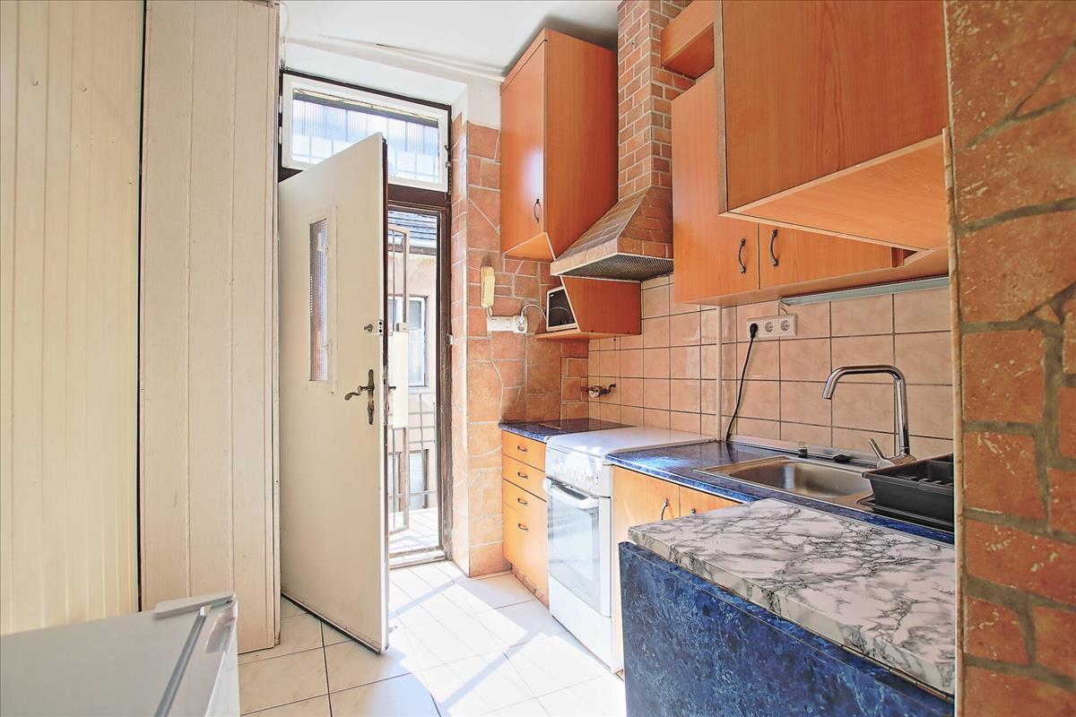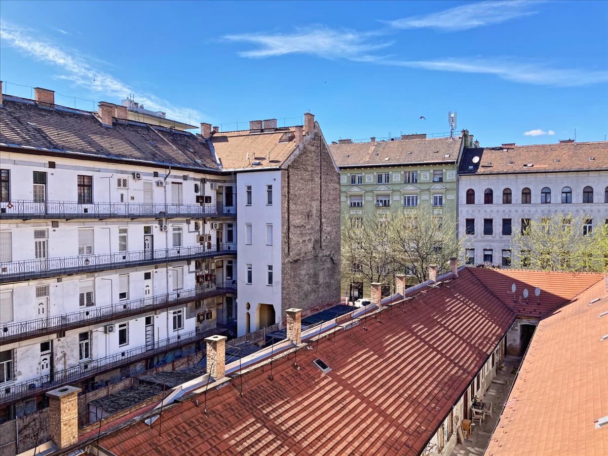 A remek hangulatú lakás az épület hátsó részén található, biztonsági ráccsal ellátott bejárati ajtaja a kőrfolyosóról közelíthető meg. Belépve a minden igényt kielégítő, szép állapotú konyhába érünk, ahonnan egy kis közlekedőn keresztül elérhetjük a zuhanyozós fürdőszobát, a légudvarra szellőző mellékhelyiséget és a tágas szobát is. a világos szoba nagyméretű, modern ablakai a ház mögötti terület épületeinek tetői felé nyílnak, különleges művészi hangulatot kölcsönözve ezzel a lakásnak.