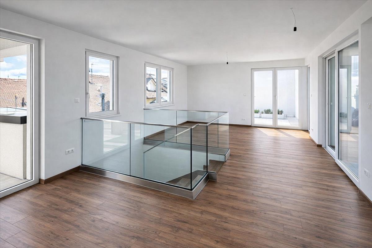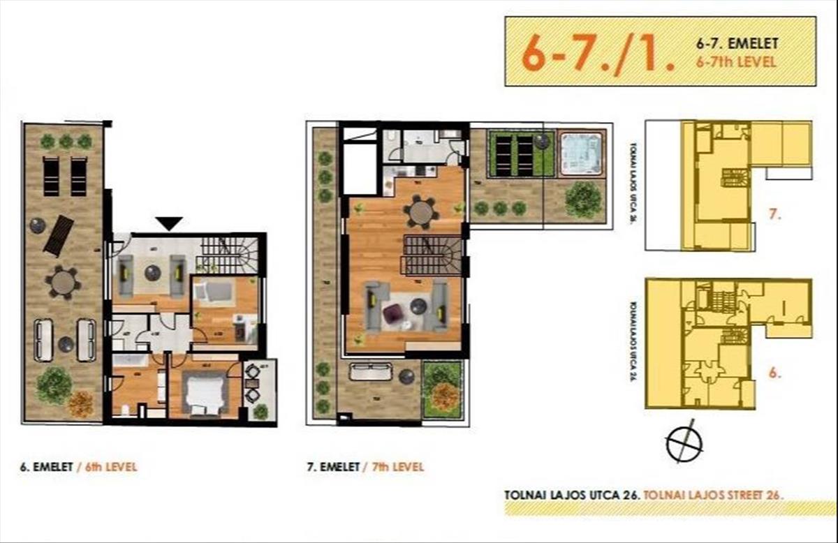A belső kétszintes kialakítású lakás a 6. És 7. emeleten található, amely 106, 4 m² lakótérrel és összesen 146, 37 m²-nyi, lenyűgöző panorámás terasszal rendelkezik, amelyekről páratlan kilátás nyílik a Gellért-hegyre és a Hármashatár-hegyre, így a városi élet és a természet látványa egyszerre élvezhető. a 4 szobás otthon rendkívül világos, köszönhetően a dny–dk–ék tájolásnak, így a napfény egész nap természetes módon járja át a tereket. Elosztása praktikus, az alsó szinten egy előtér, nappali, két szoba, fürdőszoba és háztartási helyiség, a felső szinten pedig nappali konyha-étkező és fürdőszoba kapott helyet.